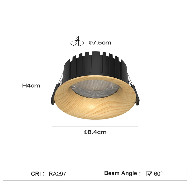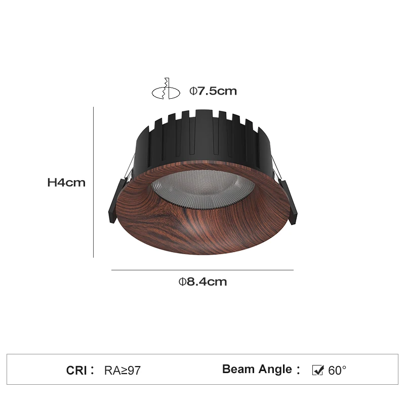 PULUOTI 75mm LED 60° Recessed Downlight 12W 3000K Walnut Full Spectrum Anti-glare Eye protection Living Room Bedroom Spot Lights