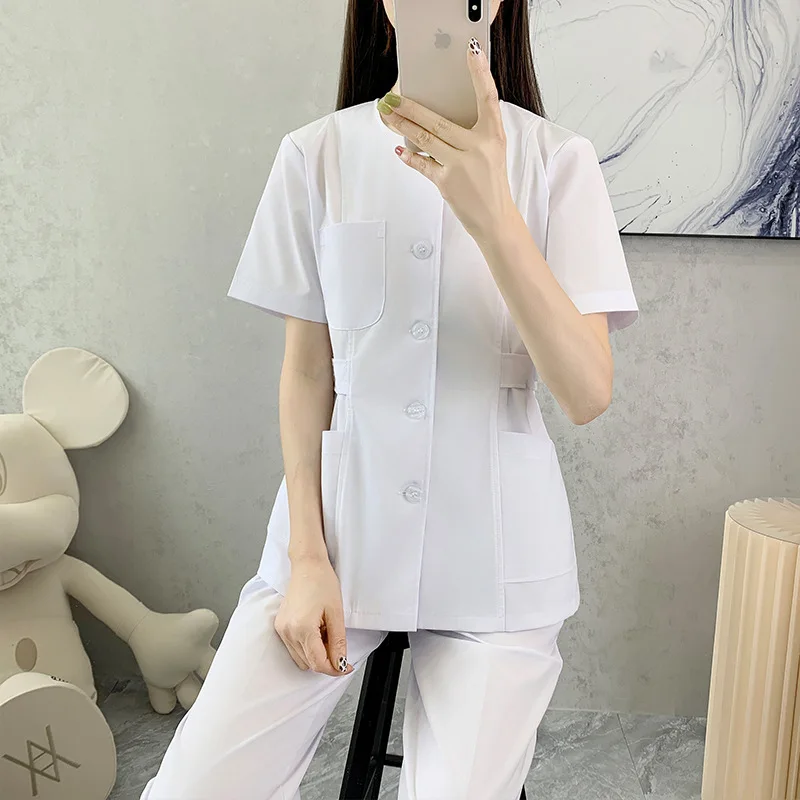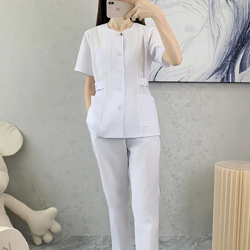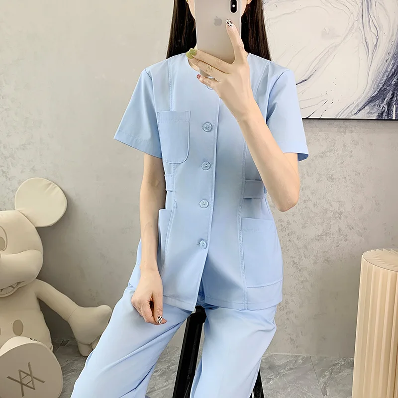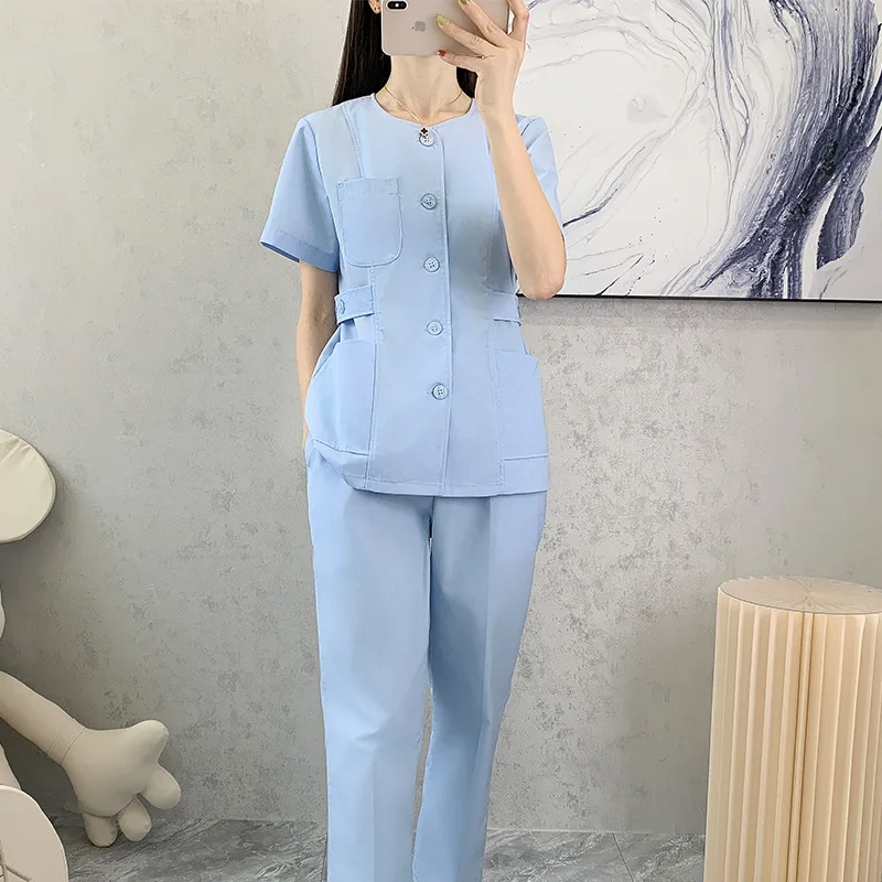 Cheap Knitted Nursing Scrubs Split Set Women Short Sleeve Summer Thin Collarless Blue Oral Dental Hospital Scrubs Uniform Set