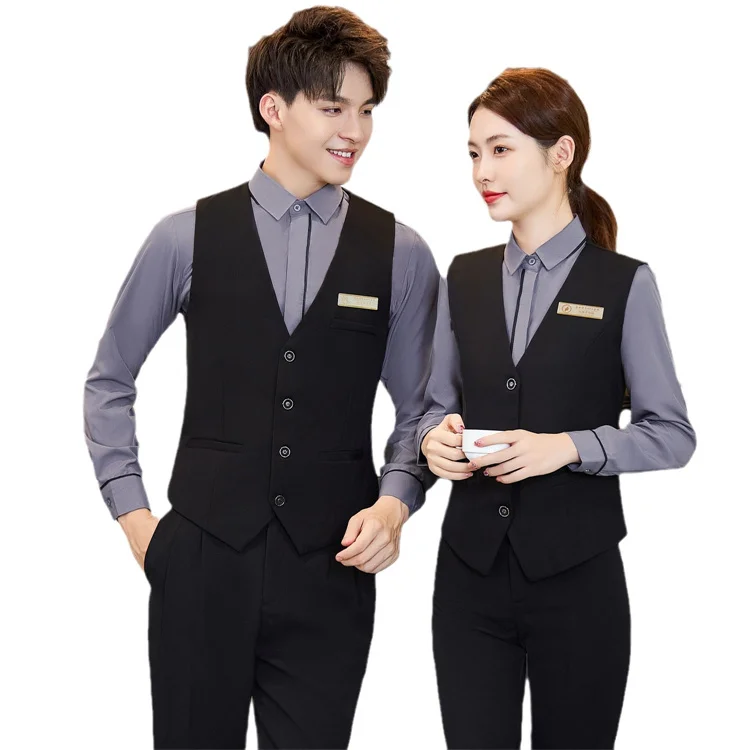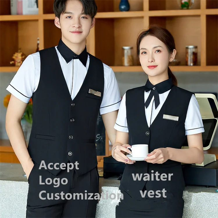 Factory Hotel Restaurant Kitchen Catering bar logo Custom Button Down Men Women Work Uniform Waiter Vest Waitress Waistcoat