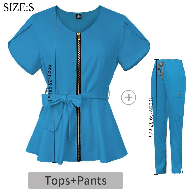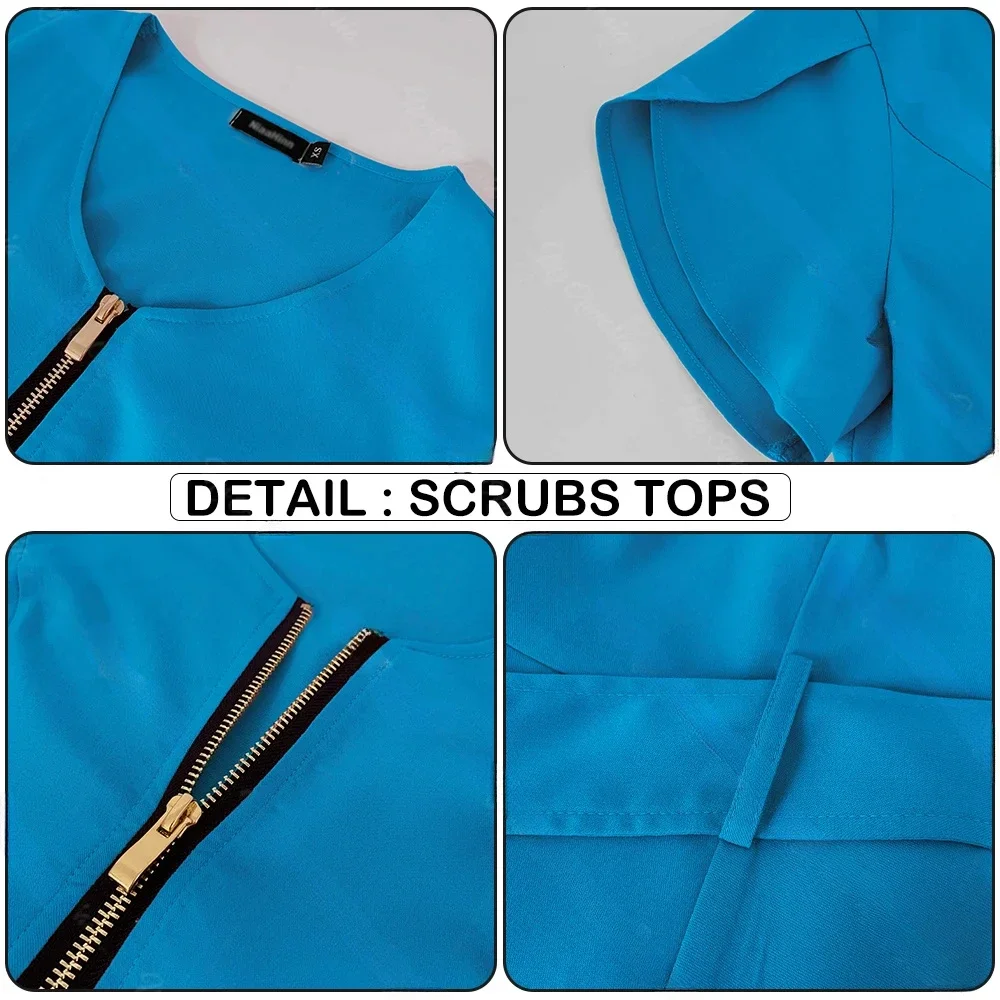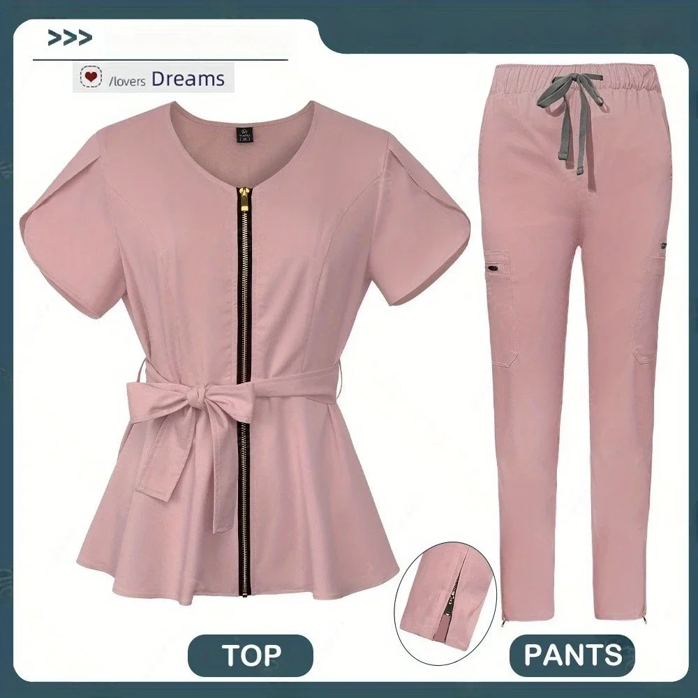Tie Waist Short Sleeve Zipper Scrub Elastic Pants Set Wide Leg Tennis Scrub Outfits Solid Color Hospital Uniform Medical Outfit