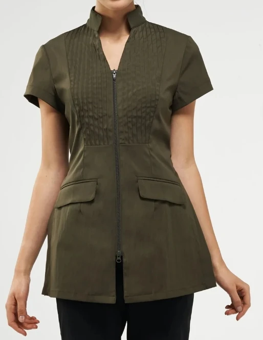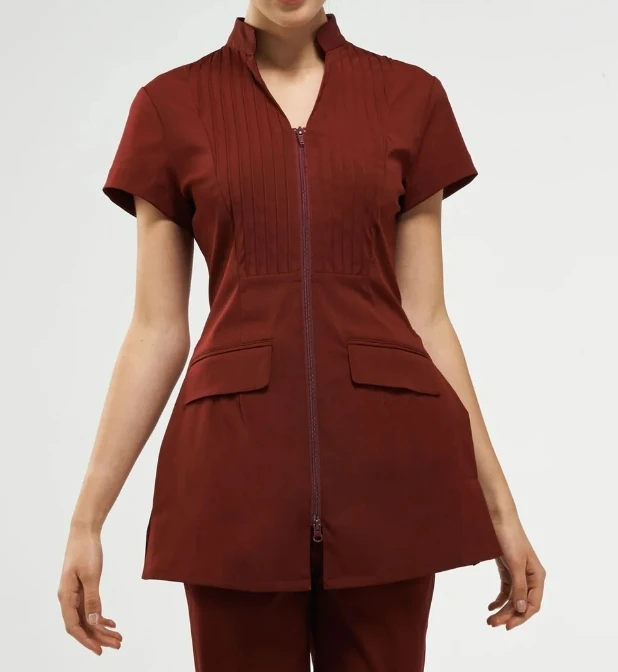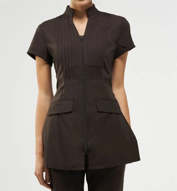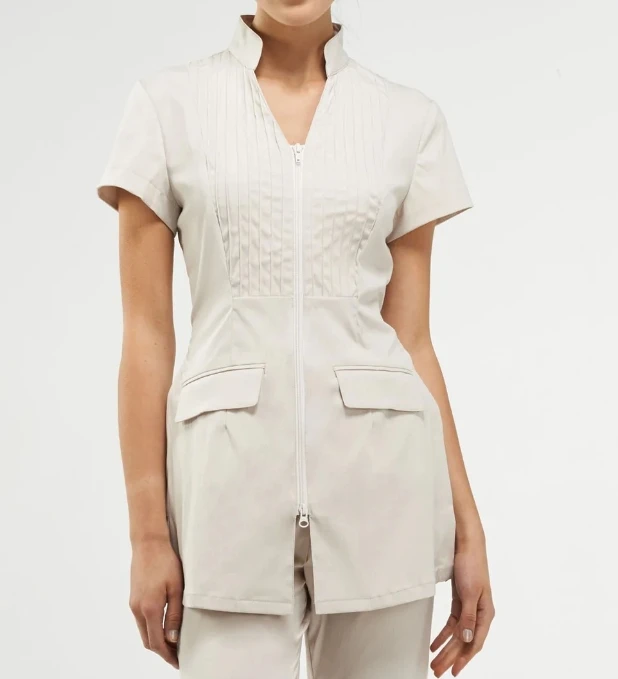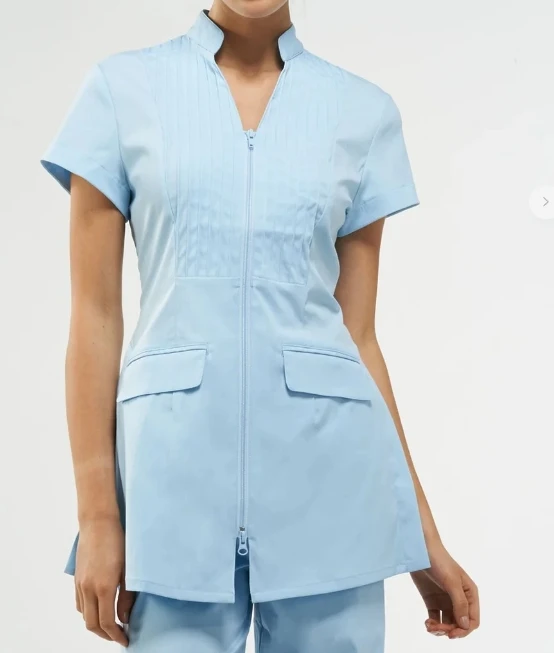 Light Blue Women's Medical Lab Coat Short Sleeved Stand Collar Zipper Pleated Front Breathable Comfortable Practical Pockets