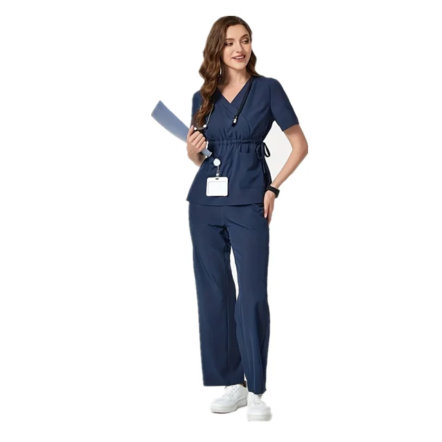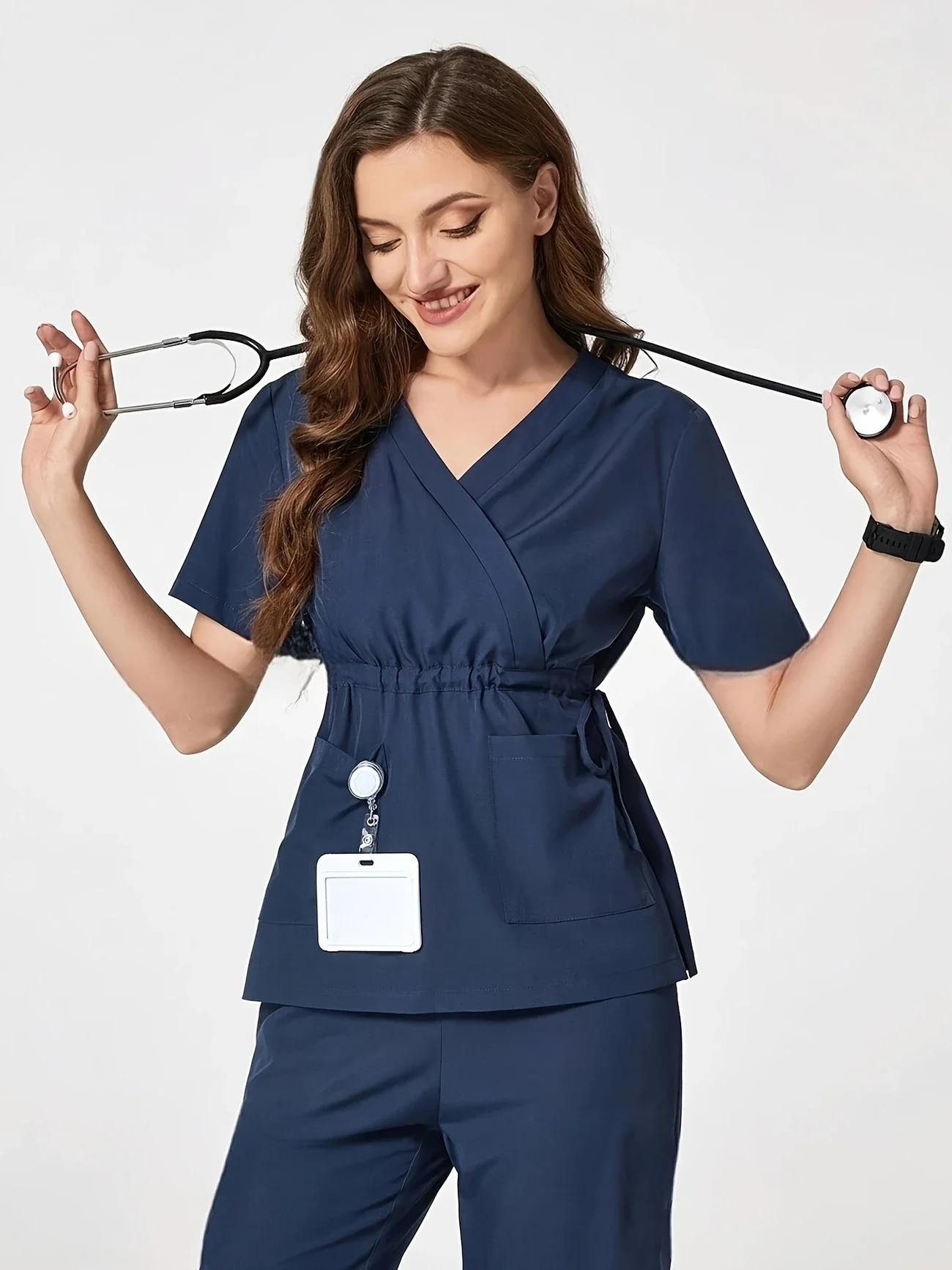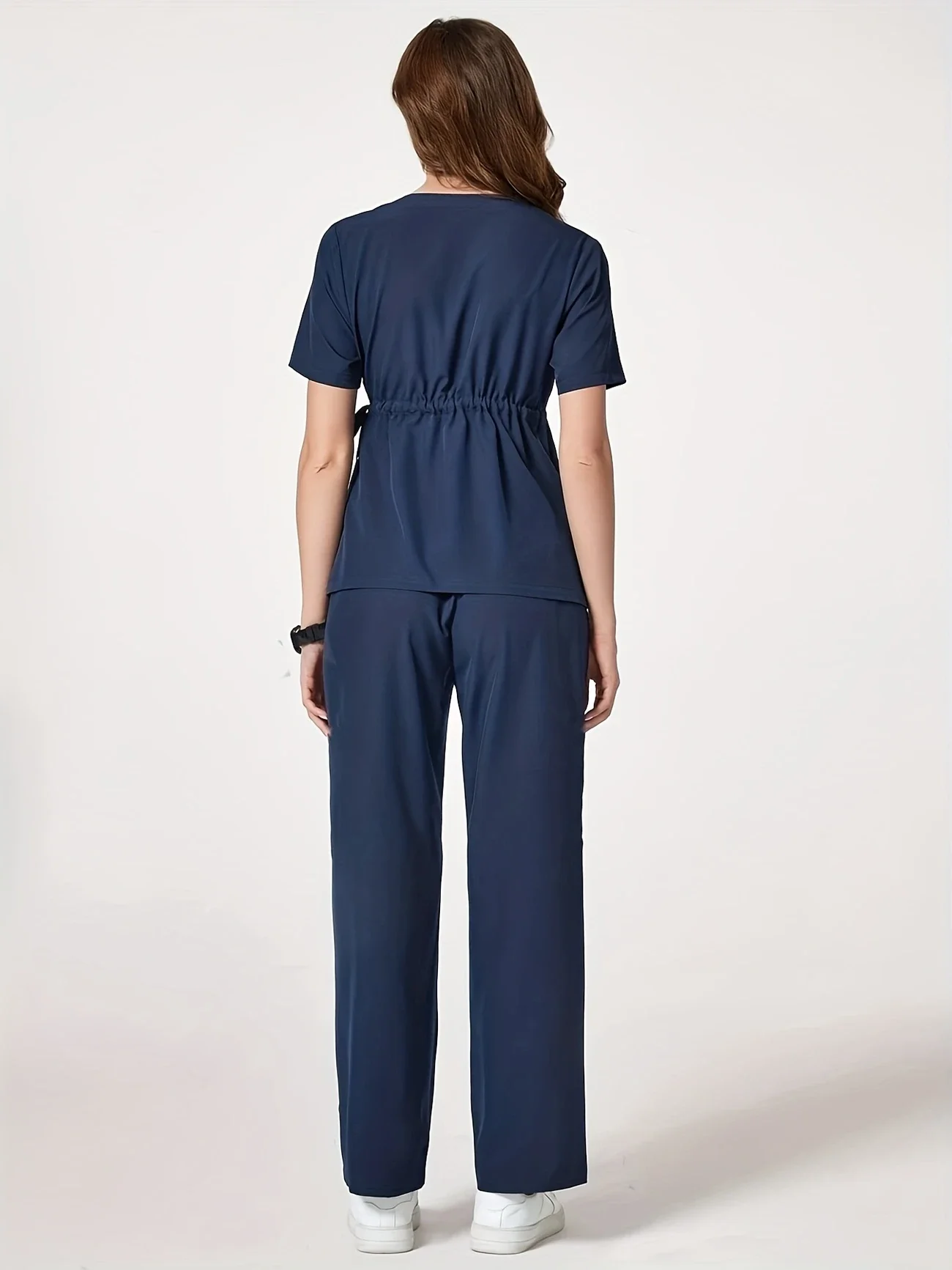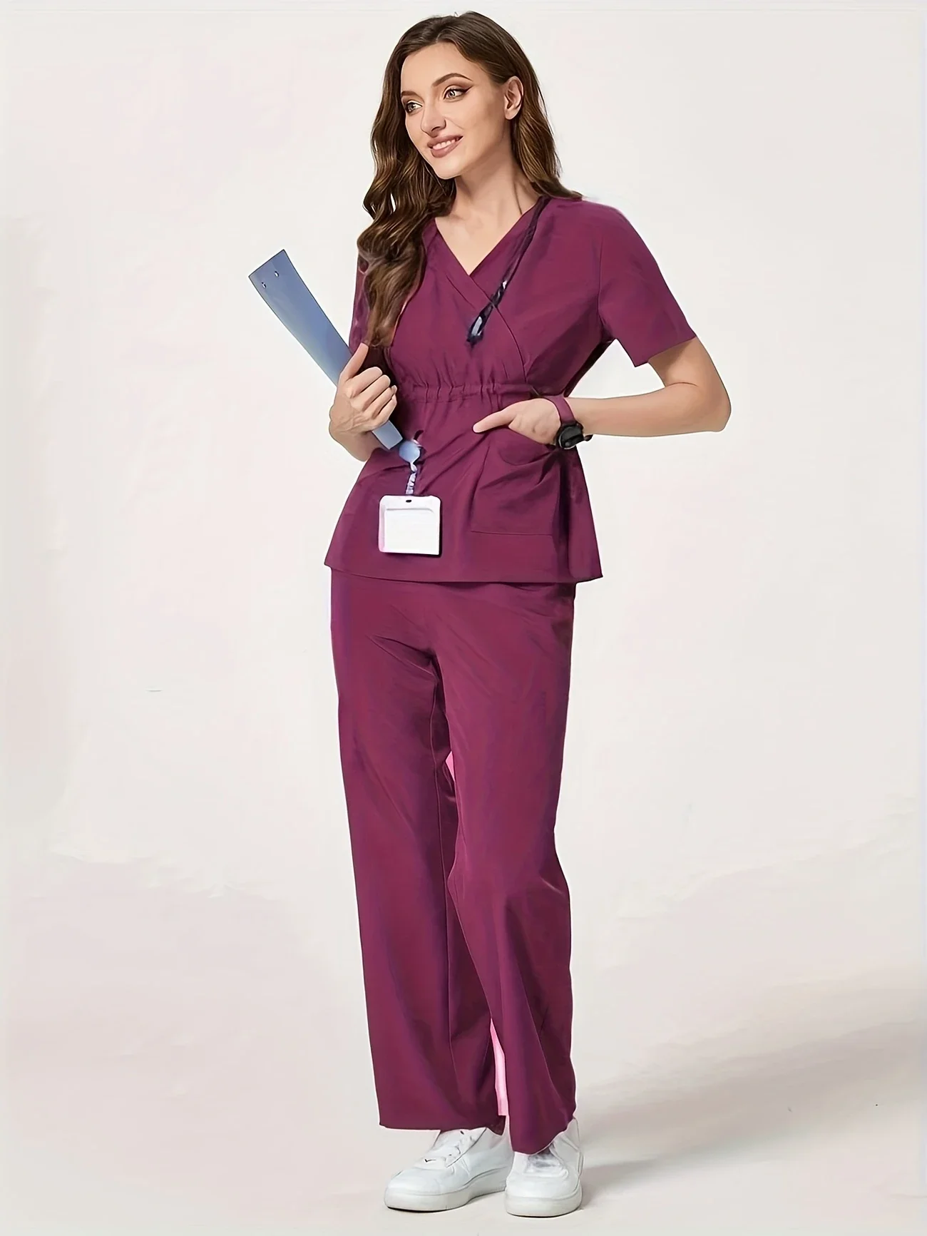Women's Knitted Short Sleeve V-Neck Scrub Drawstring Waist Nursing Uniform Hospital Medical Scrubs Breathable Comfortable Sets