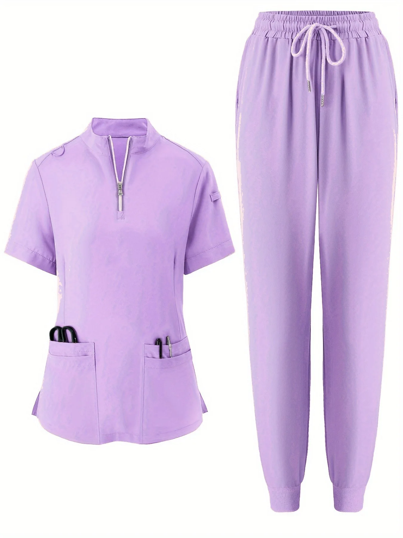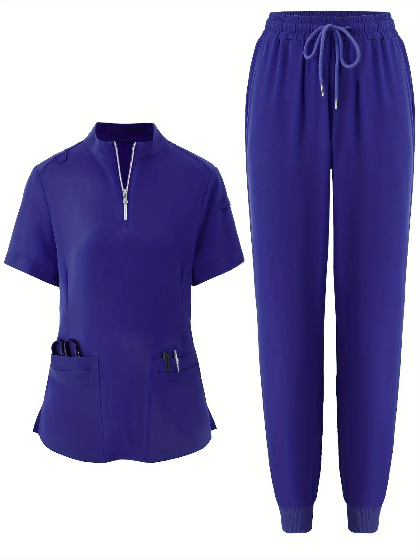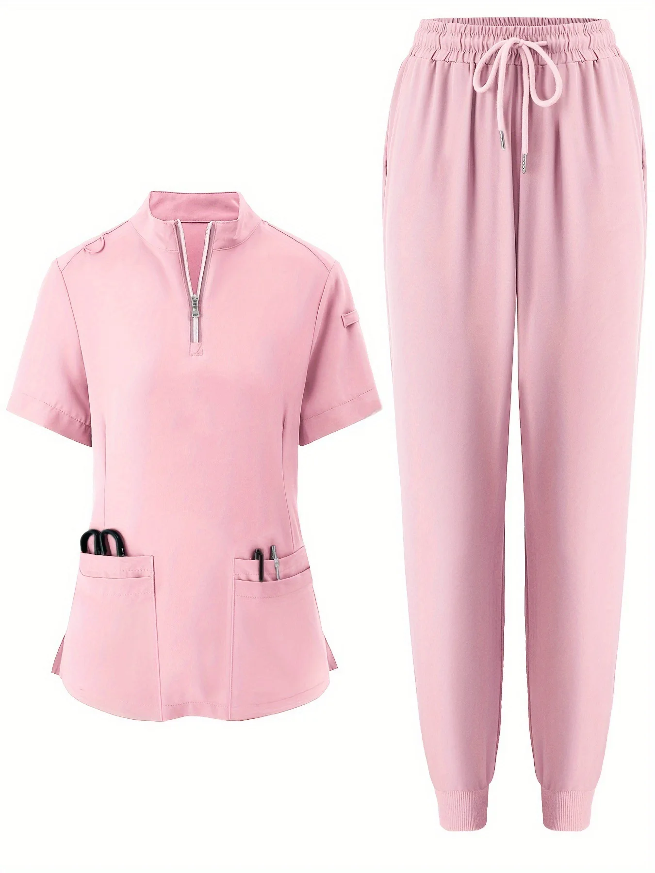 Solid Knitted Nurse Two-piece Scrub Set V Neck Short Sleeve Top Long Length Pocket Pants Breathable Comfortable Hospital Use