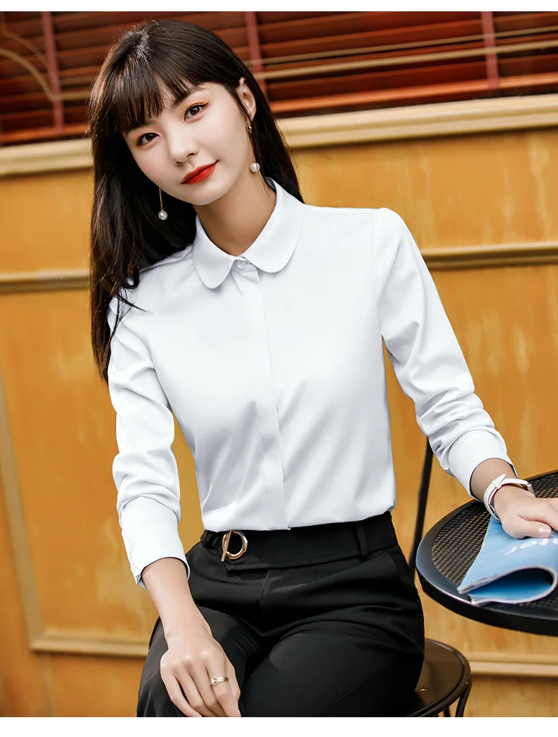 Professional Women's White Long-sleeved Crew Neck with Button-down Detailing, Suitable for Commuting and Formal Work Wear
