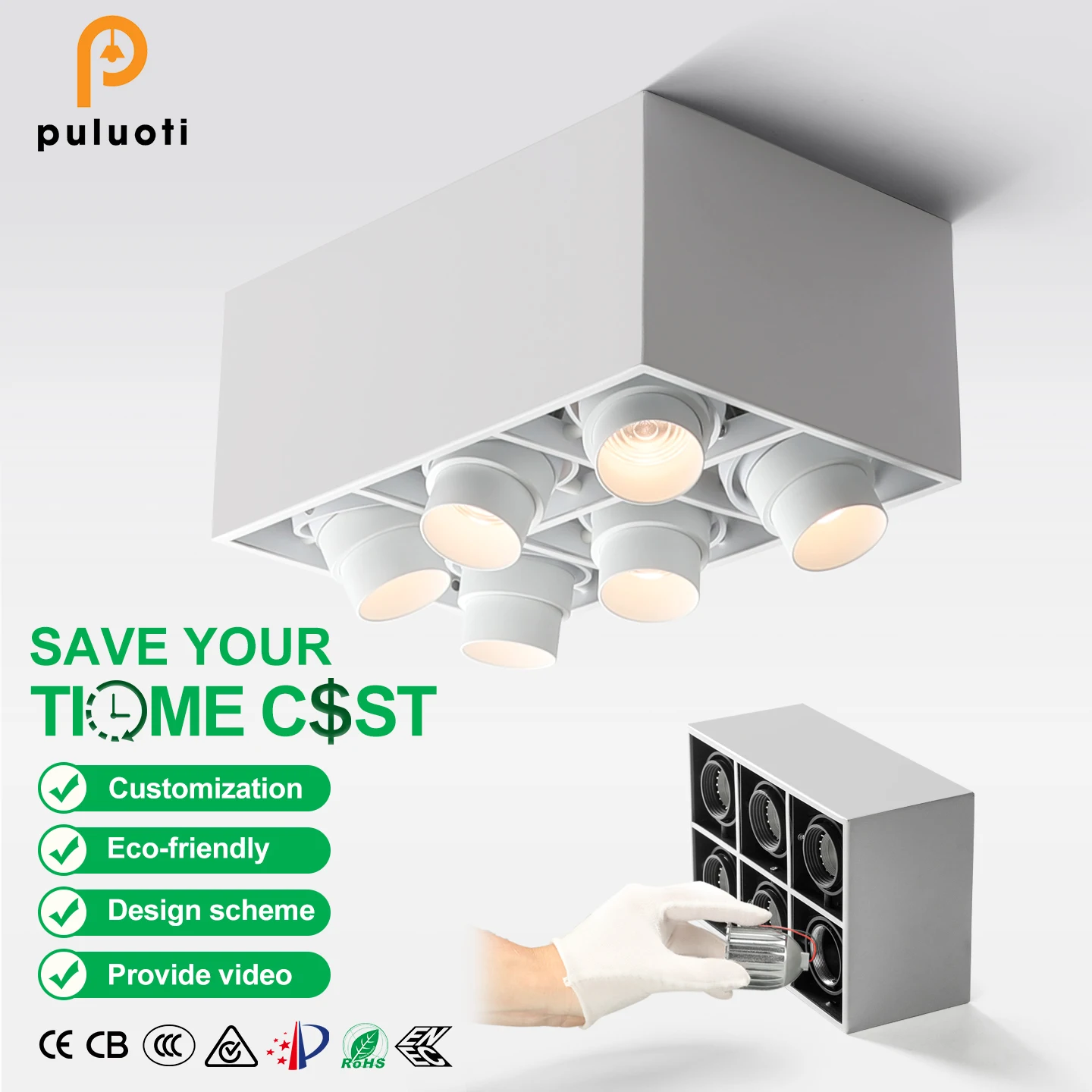 PULUOTI 60W CE Rohs LED Square Spotlight Modern Commercial Indoor Ceiling Mounted Lighting White Black Aluminum Exposed Surface