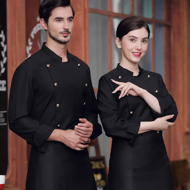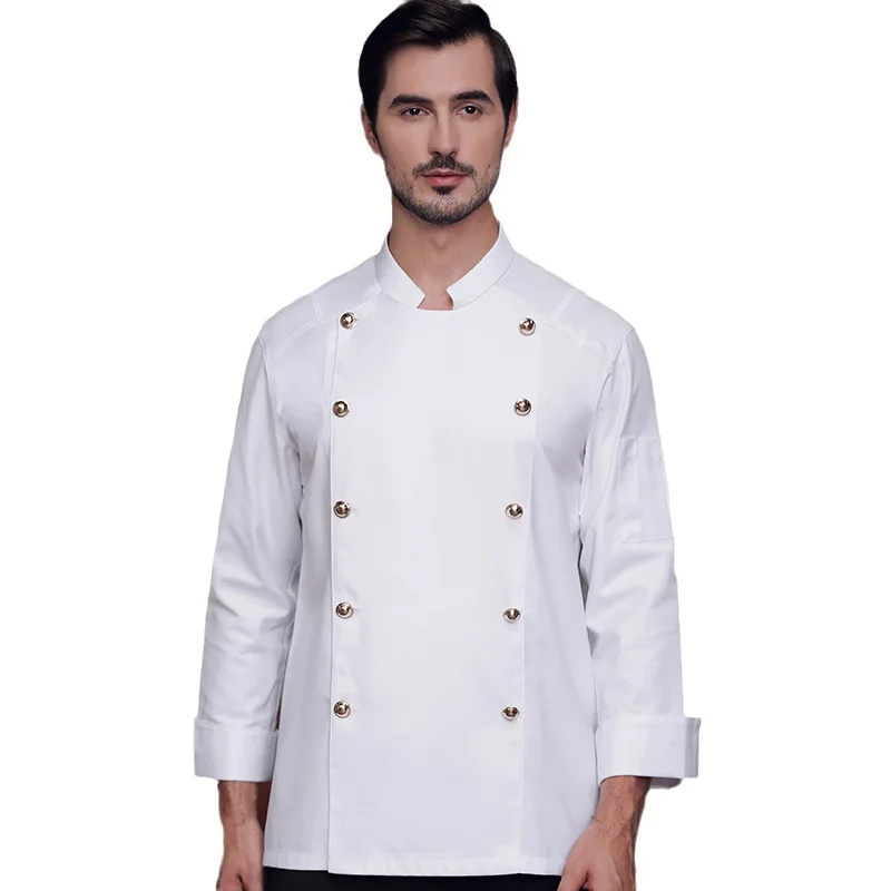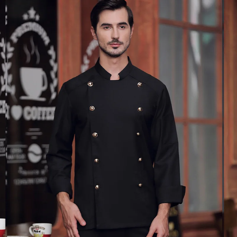 Unisex High-End Long Sleeve Chef Uniform Custom Logo Twill Fabric with Double Row Gold Buttons for Kitchen Use