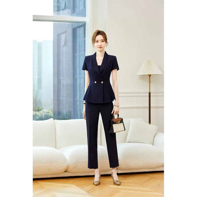 Navy Blue Professional Female Suit Short-Sleeved Hotel Managers Uniform Jewelry Store Overalls