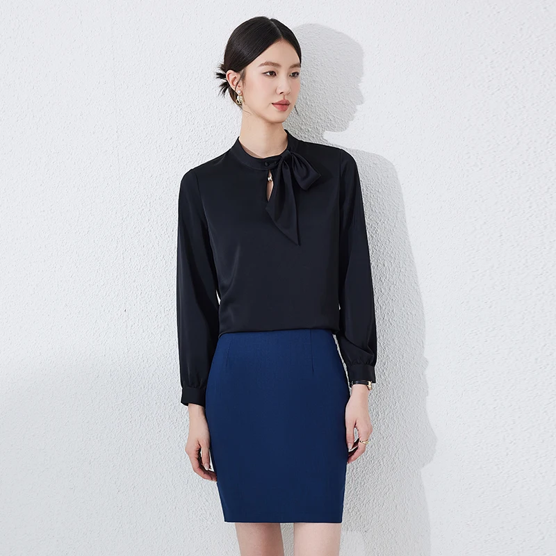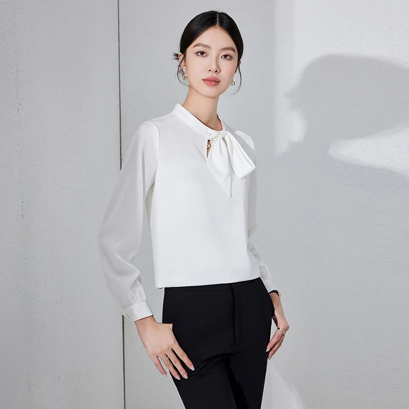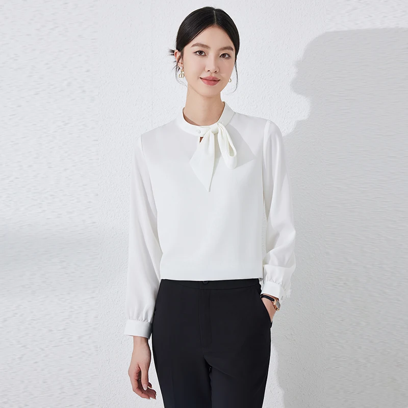 Professional Women's White Long-sleeved Crew Neck with Button-down Detailing, Suitable for Commuting and Formal Work Wear