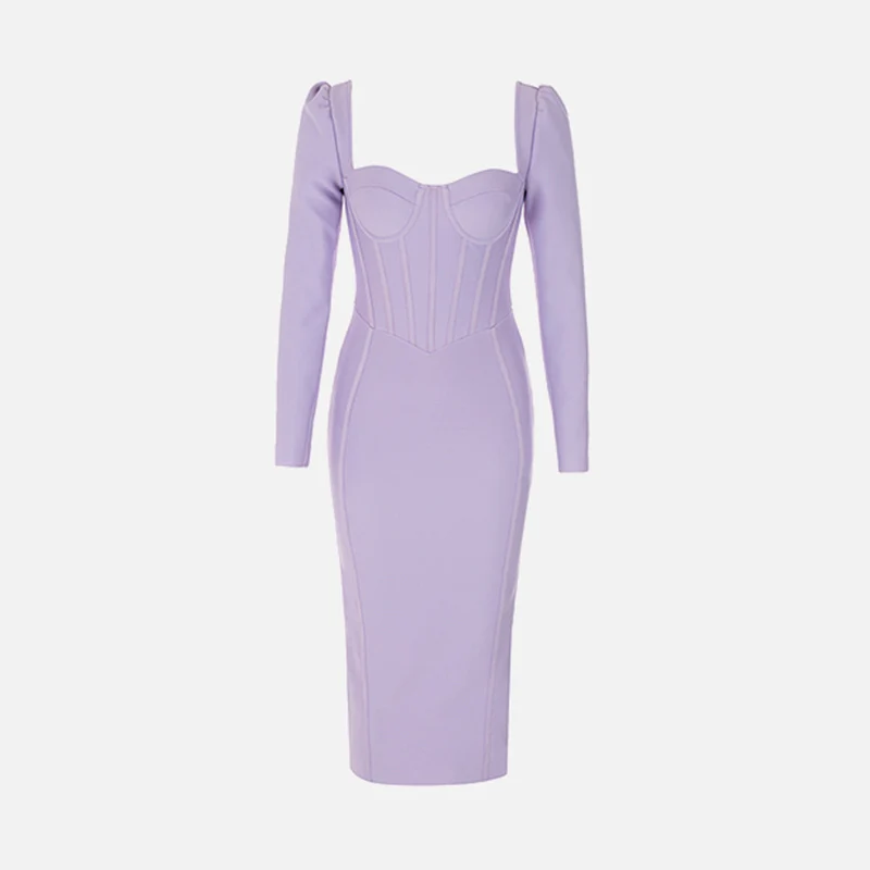 New Arrival Trendy Midi Purple Knit Dress for Women Casual V Neck Bodycon Long Sleeve Elegant Ladies Outfit Dress