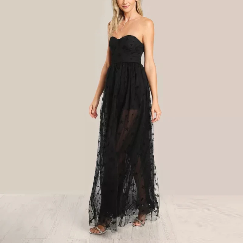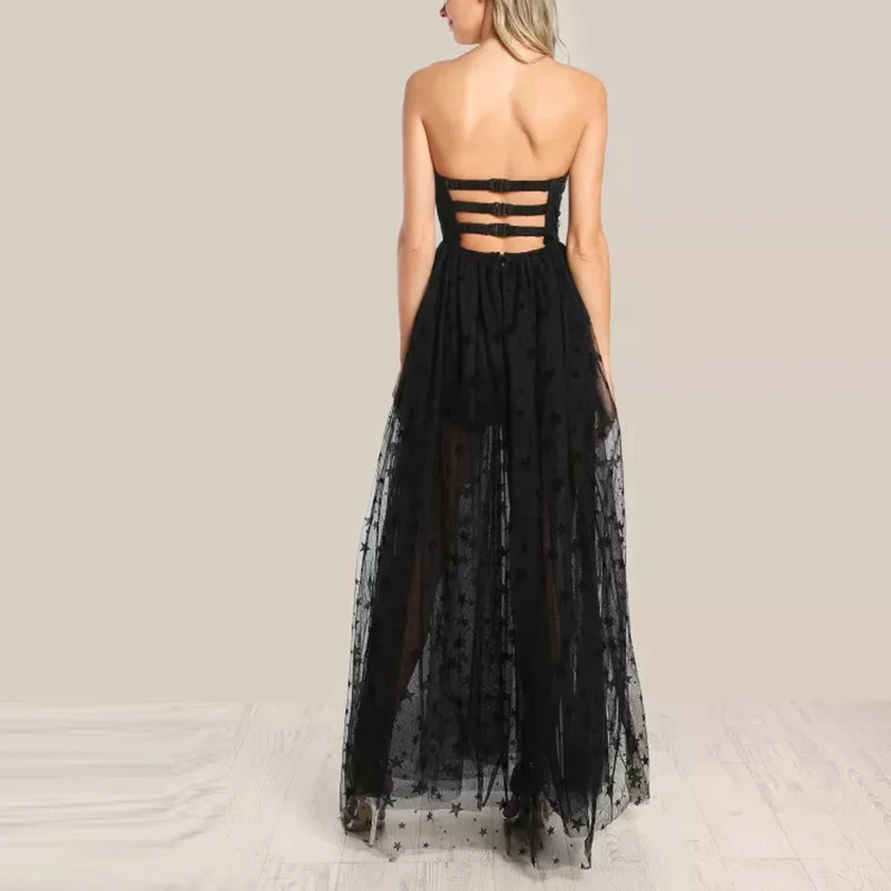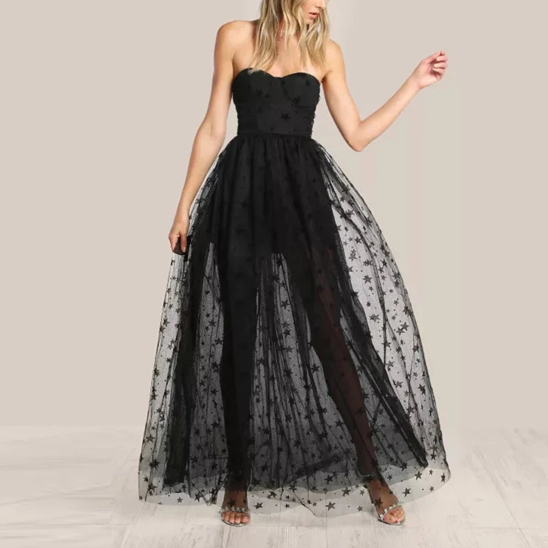 Fashion Black Star Mesh Overlay Strapless Bustier Dress Off Shoulder Evening Women Sleeveless Maxi Dress