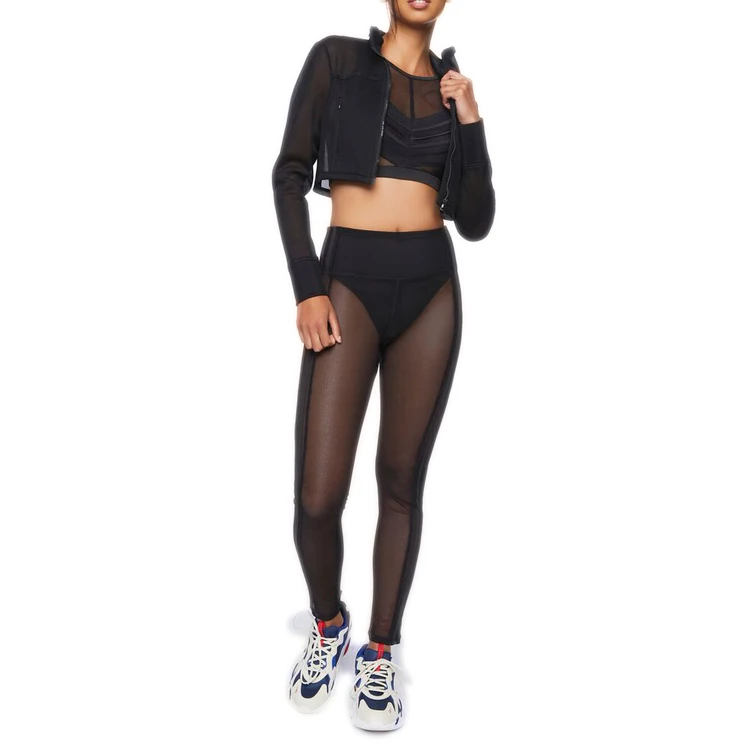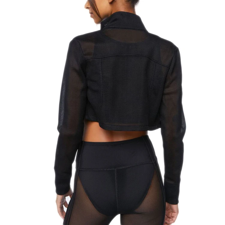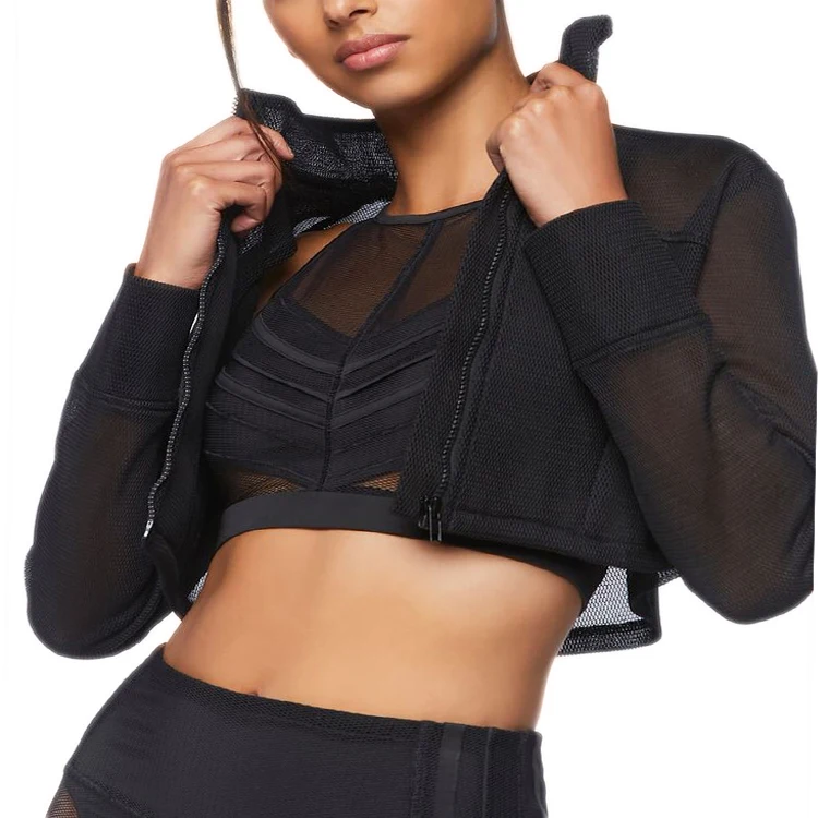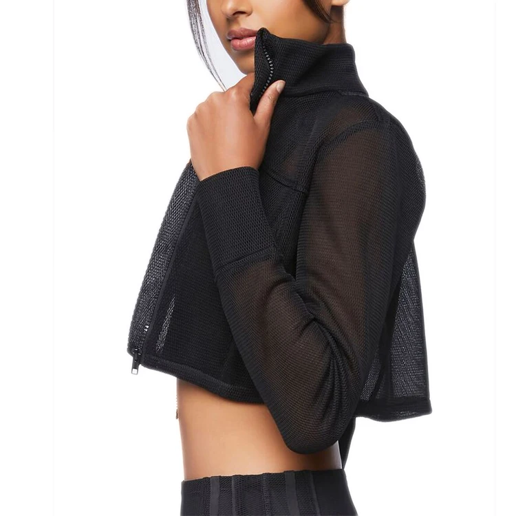 Custom Wholesale Women Active-wear Hollow Out Mesh Jacket Full Zip up Sweatshirt Sheer Jacket Crop Top With Pockets