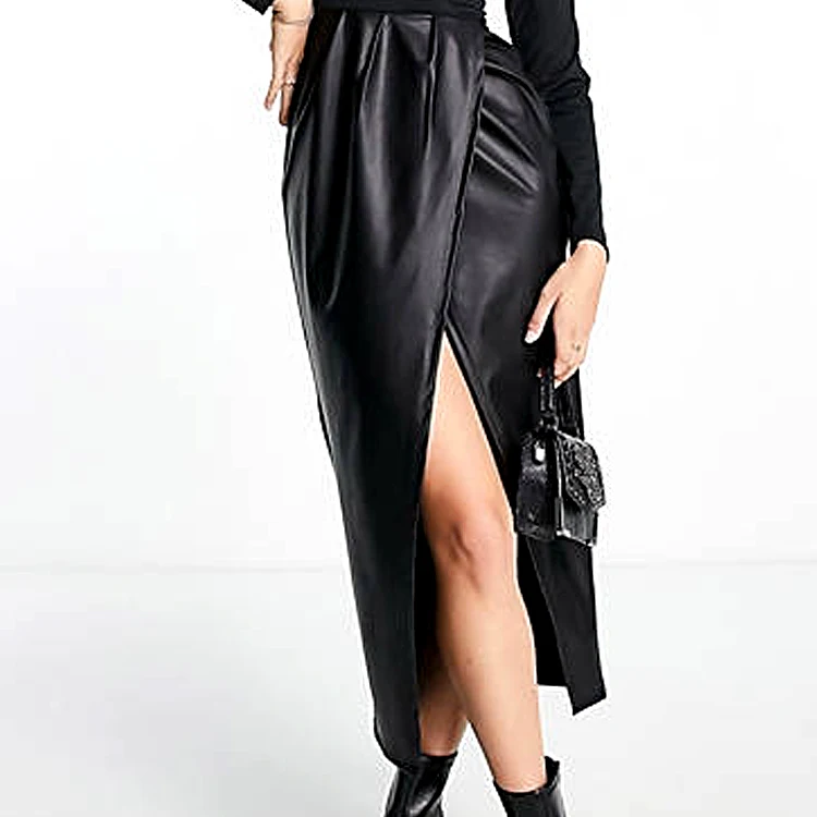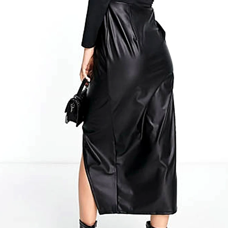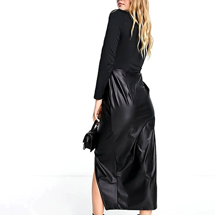 Women's Casual Dresses Long Sleeve Bodycon Pencil Party Midi Dress With Sexy Clip Pu Leather Skirt