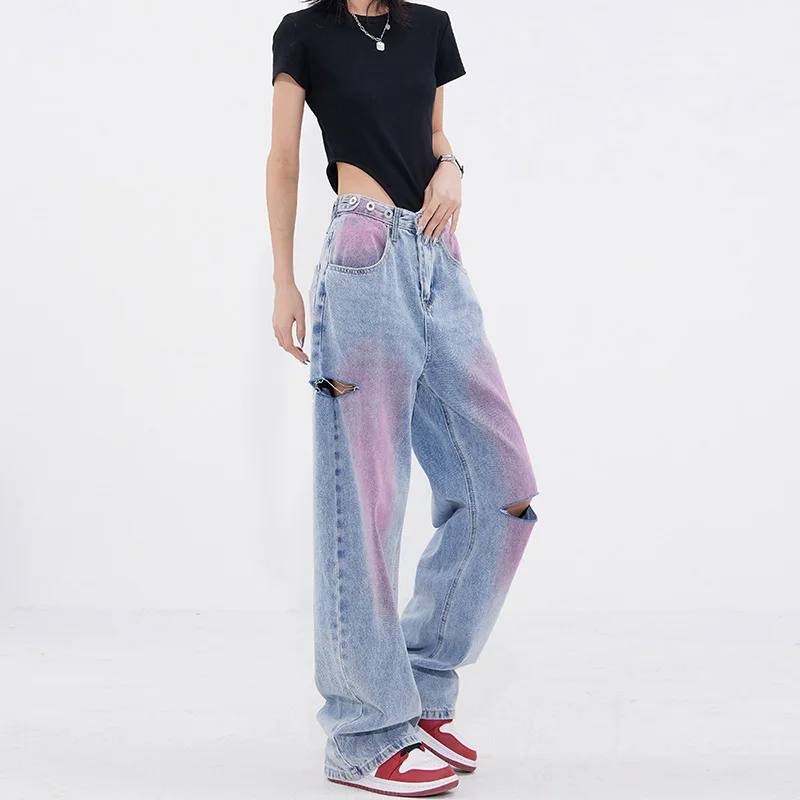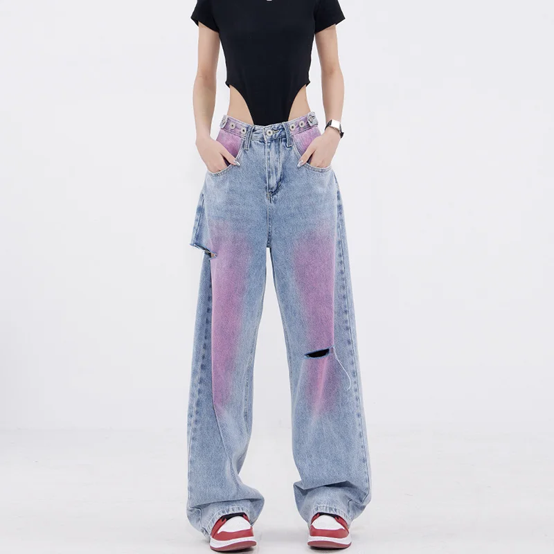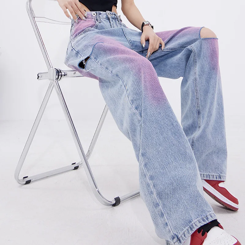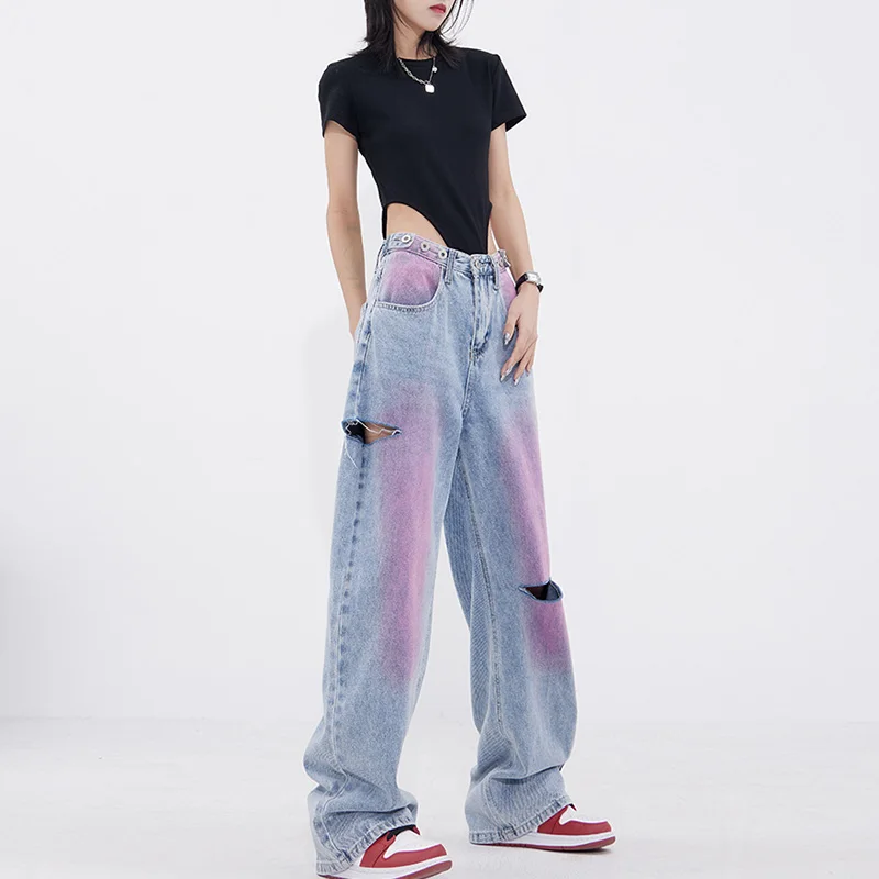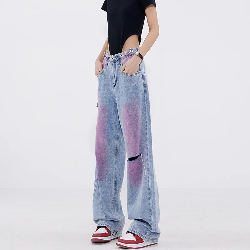 New Custom Wholesale Women Causal Paint Wide-leg Denim Pants High Waist Fashion Graffiti Vintage Wash Jeans