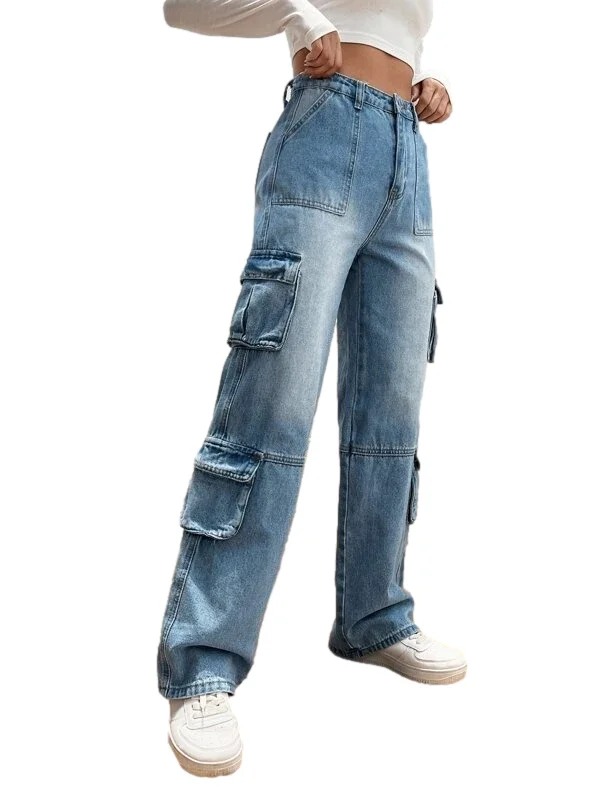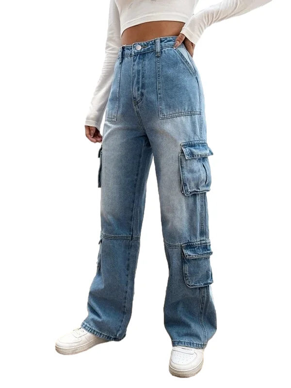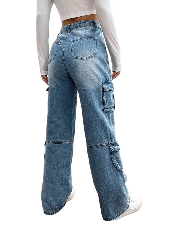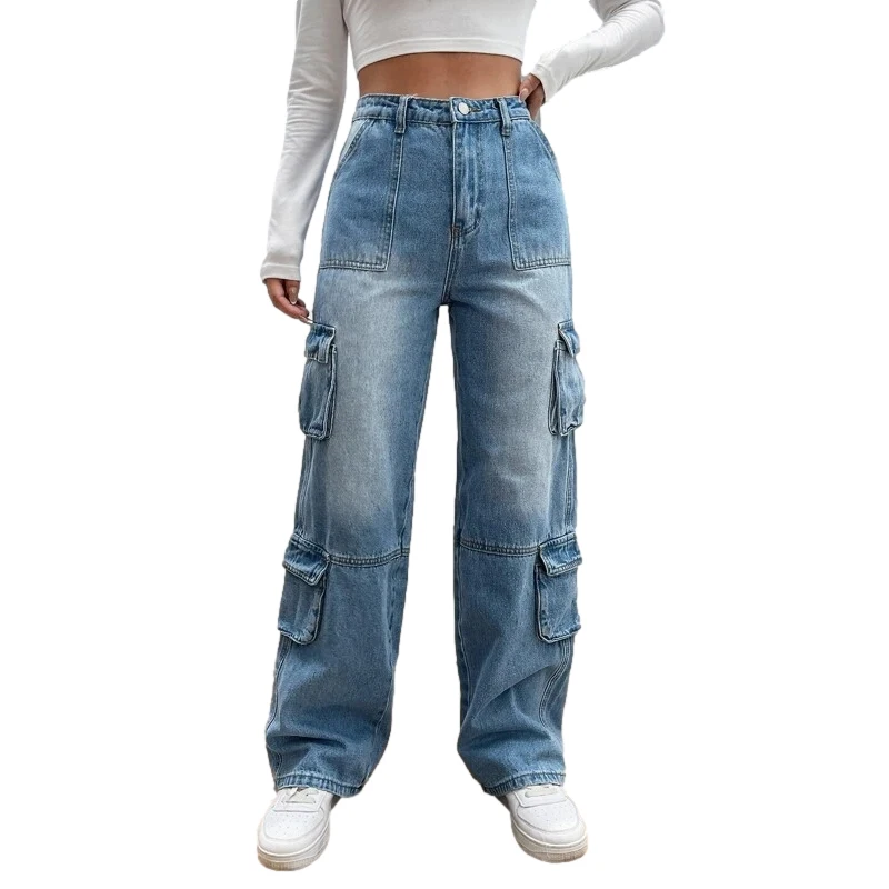 Custom Factory High Quality Women Cargo Pants Wide Leg Plus Size Cargo Jeans 6 Pocket Baggy Street-wear Pantalones