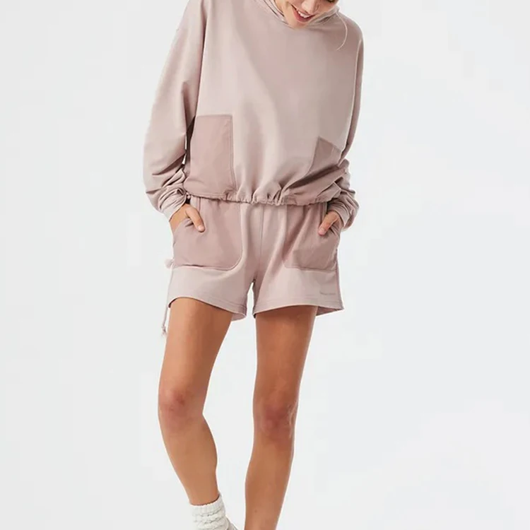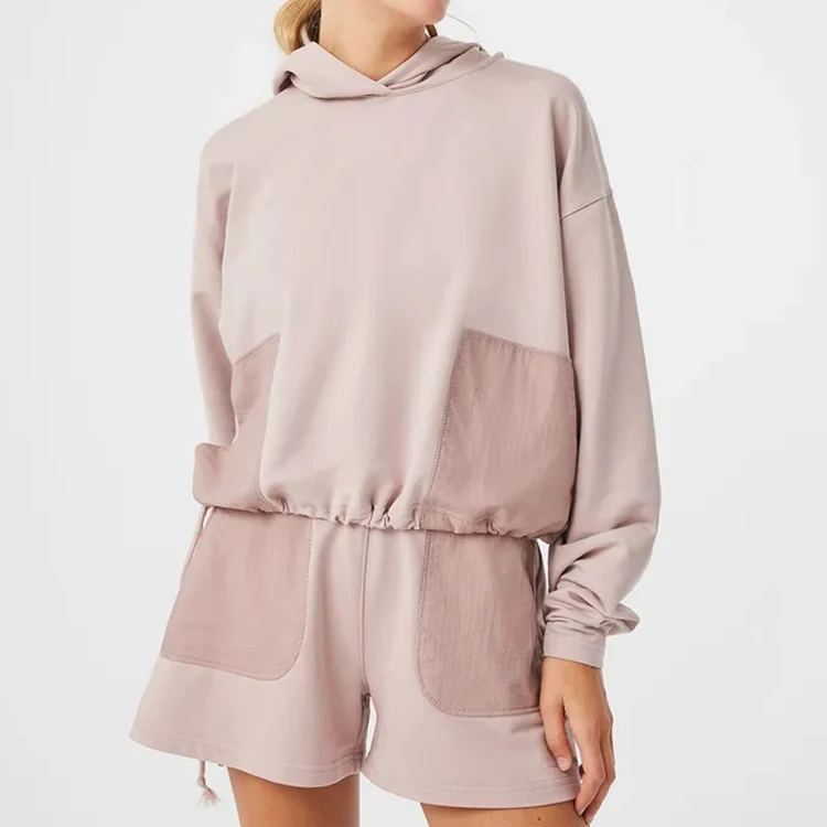 Custom Women Contrast Fabric 2 Piece Long Sleeve Hooded Shorts Tracksuit Set