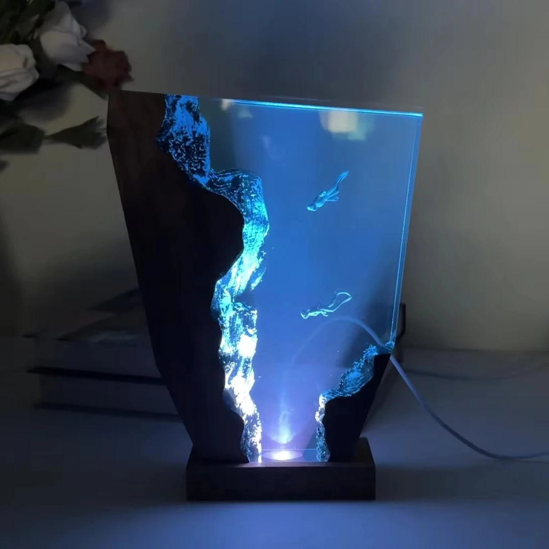 JACKSUN Led Ocean Resin Wood Night Light Lamp Handmade Whale Diver Lamp Deep Sea Diver Cave Desk Decor Lamp Birthday Gift Lamp
