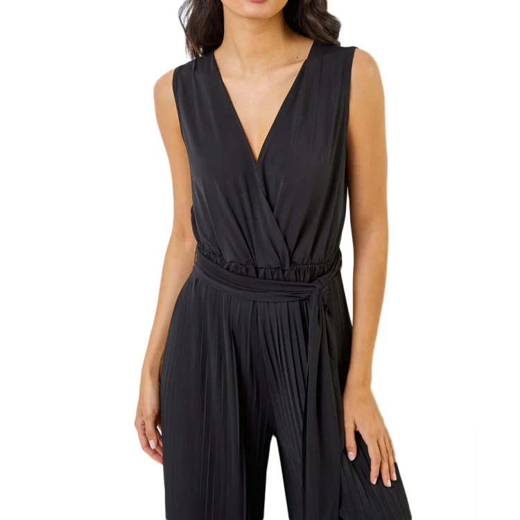 Women Jumpsuit Deep V Neck Sleeveless Wrap Waist Tie Detail Pleated Jumpsuit in Black Long Rompers Wide Leg Pants Suit