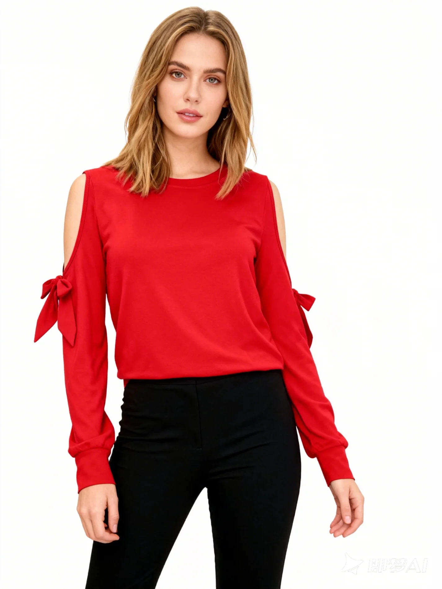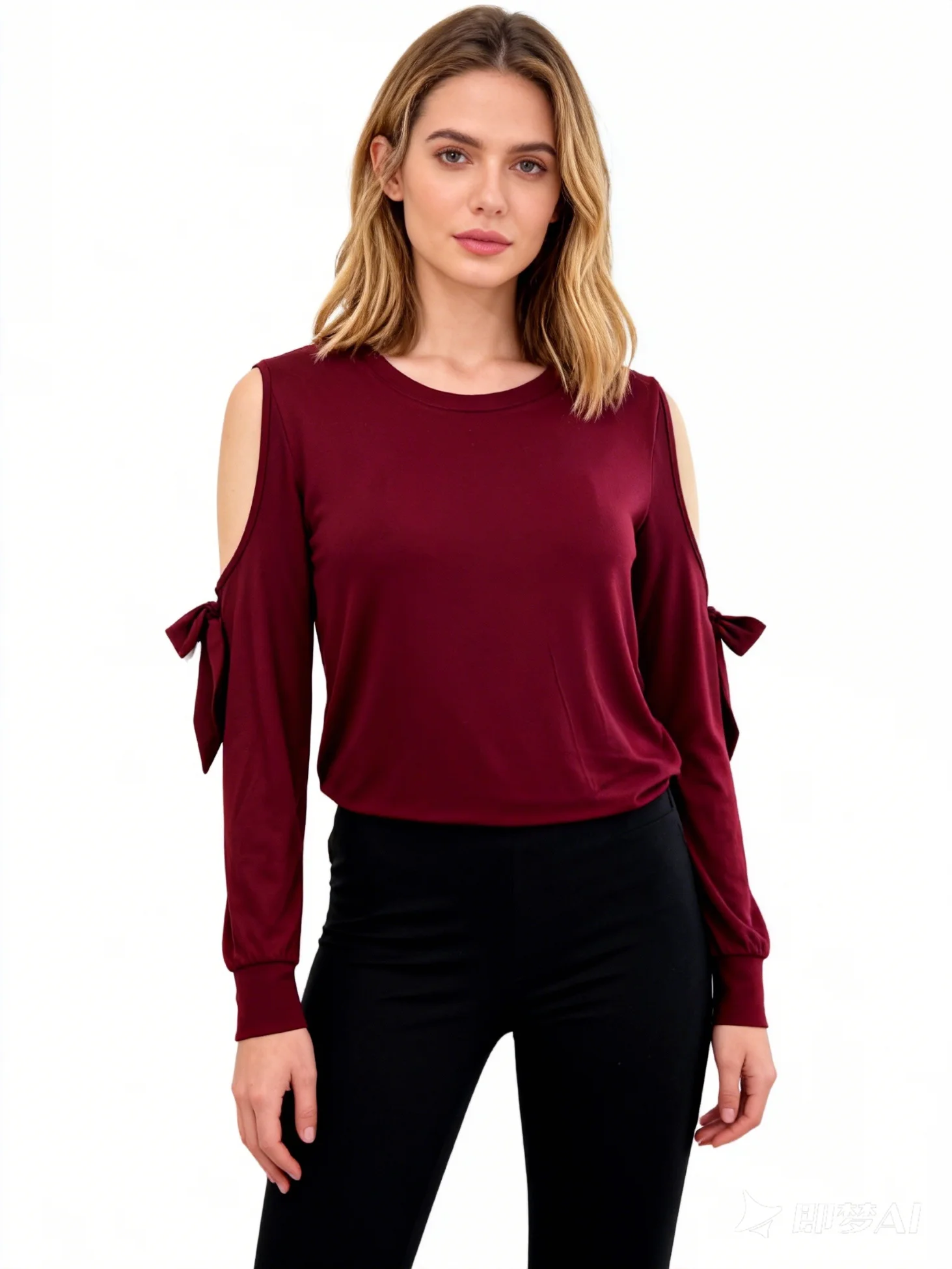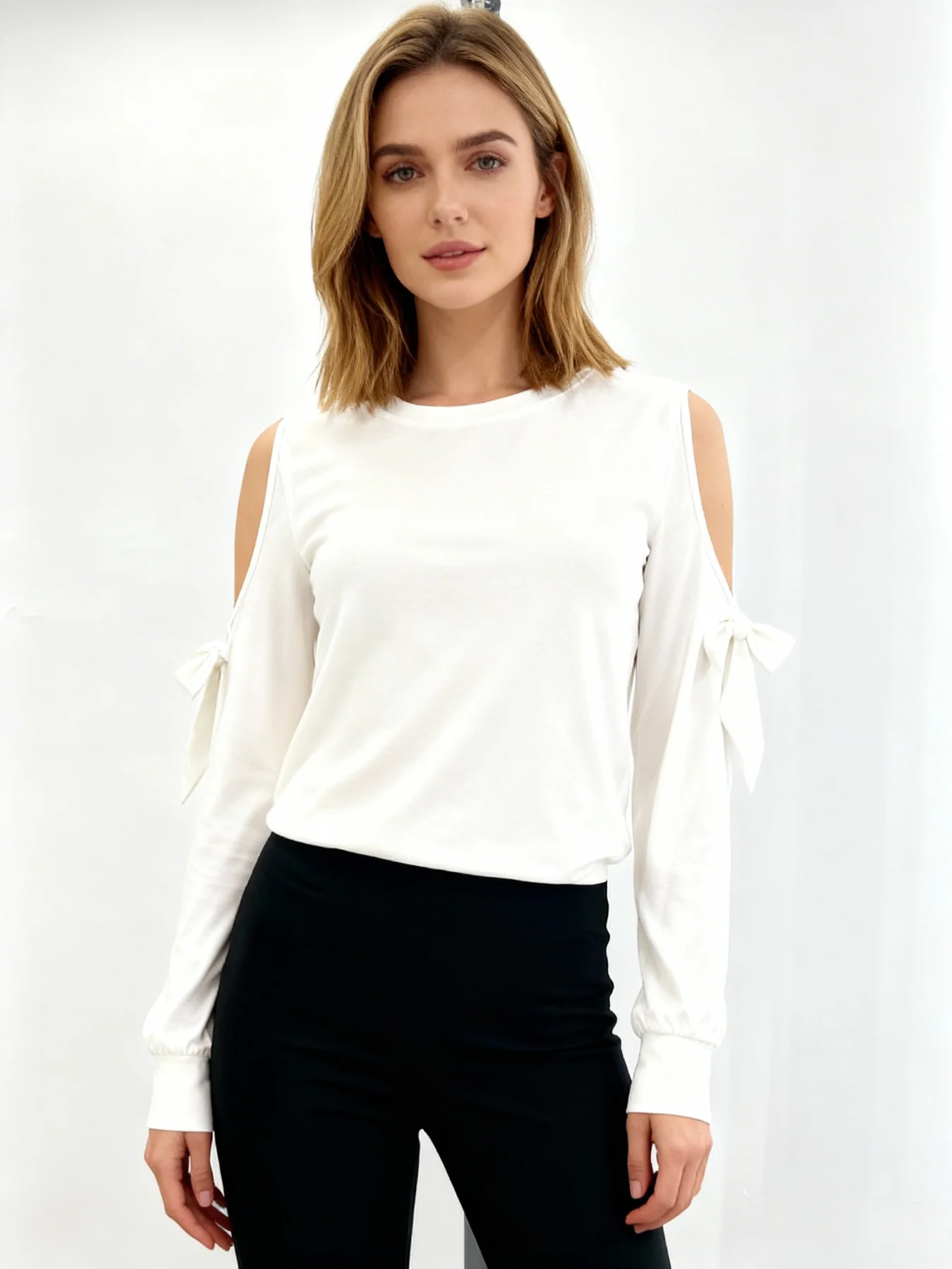 Women's Slim Fit Elegant Round Neck Cold Sleeve Bow Tie Cut Out Knitted Rayon Spandex Solid Summer Fashion Top