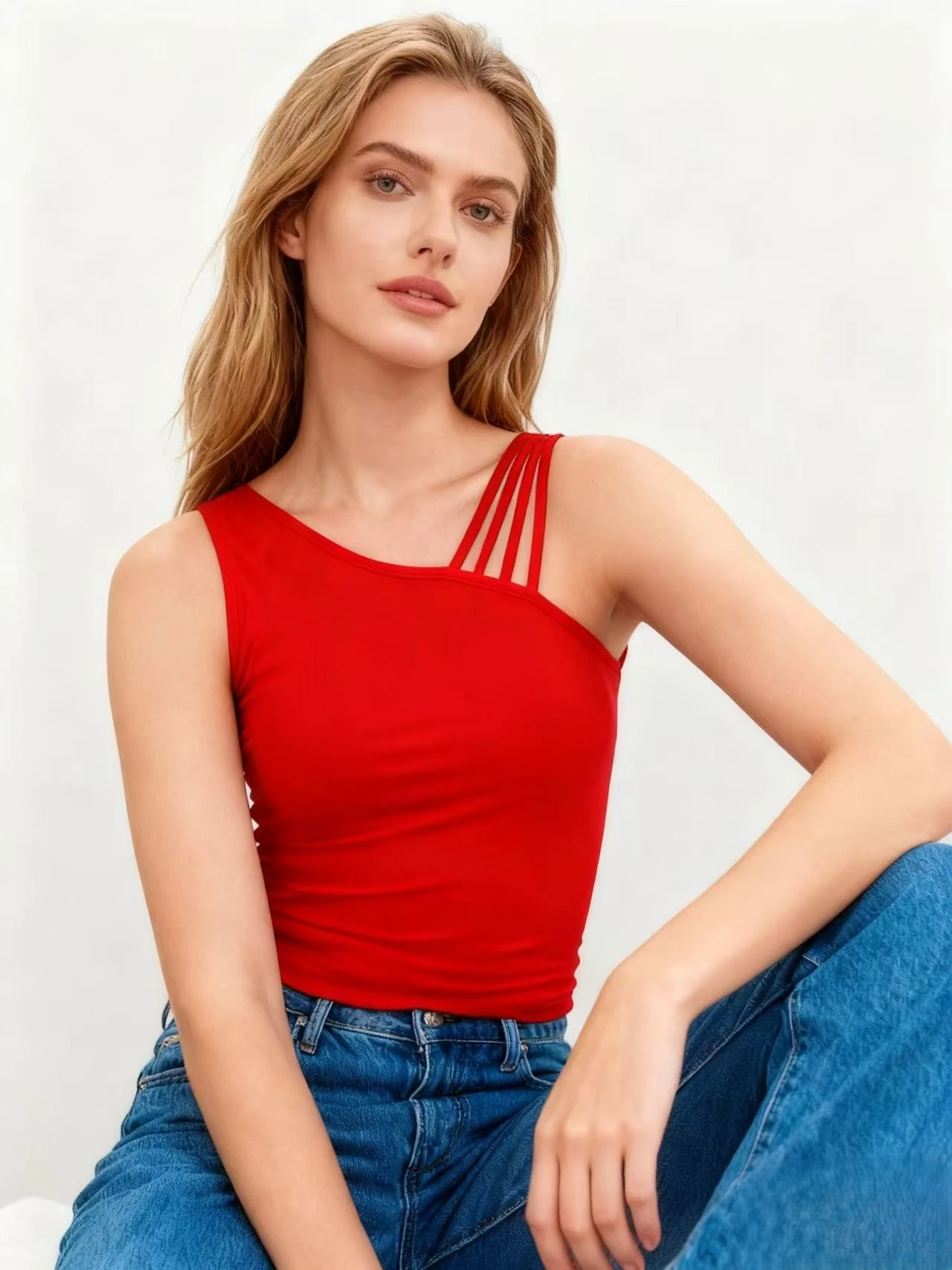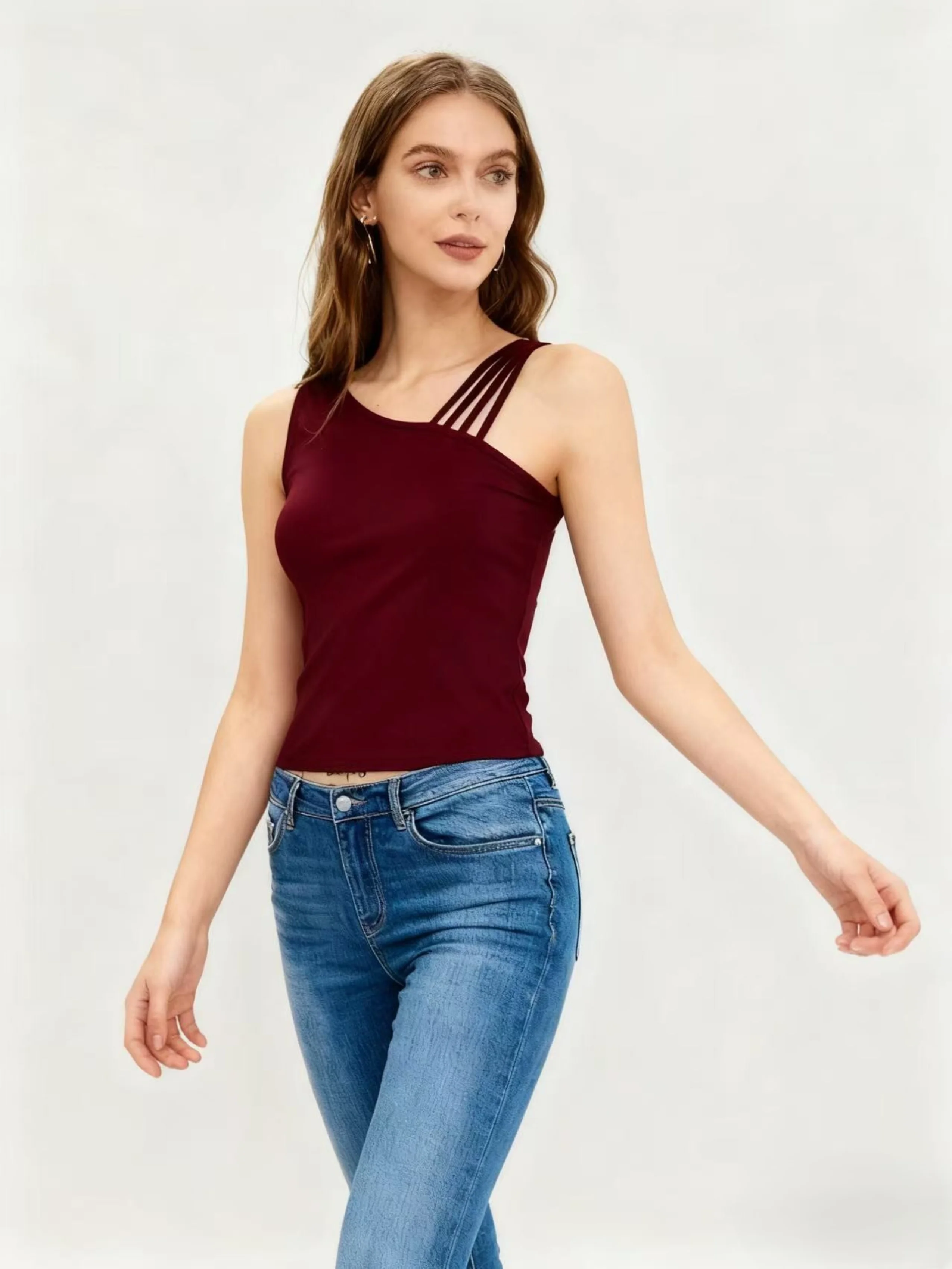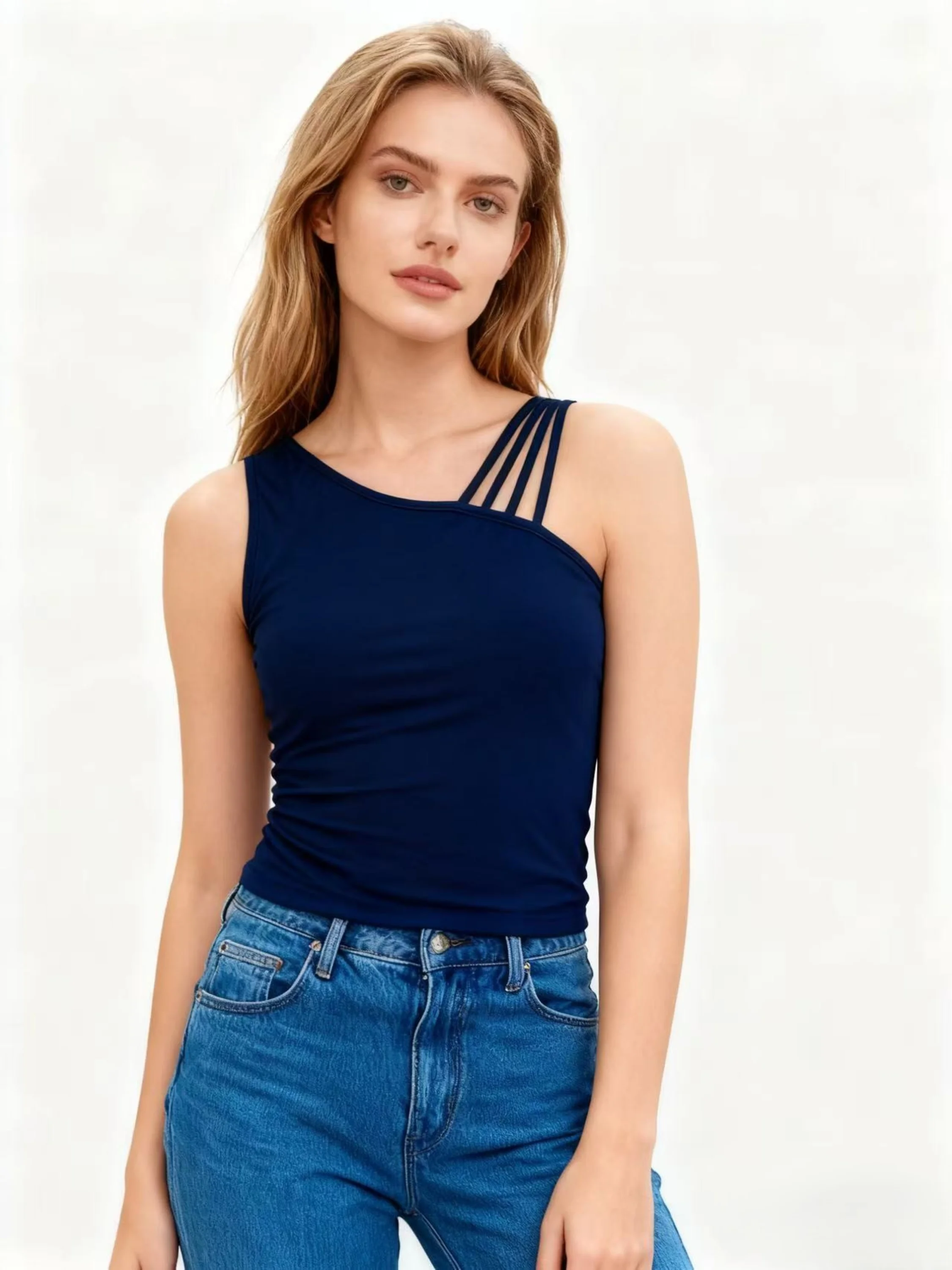 Women's Summer Knitted Soft Stretch High Quality Chic Asymmetric Multi - Strap Slim - Fit Tank Top