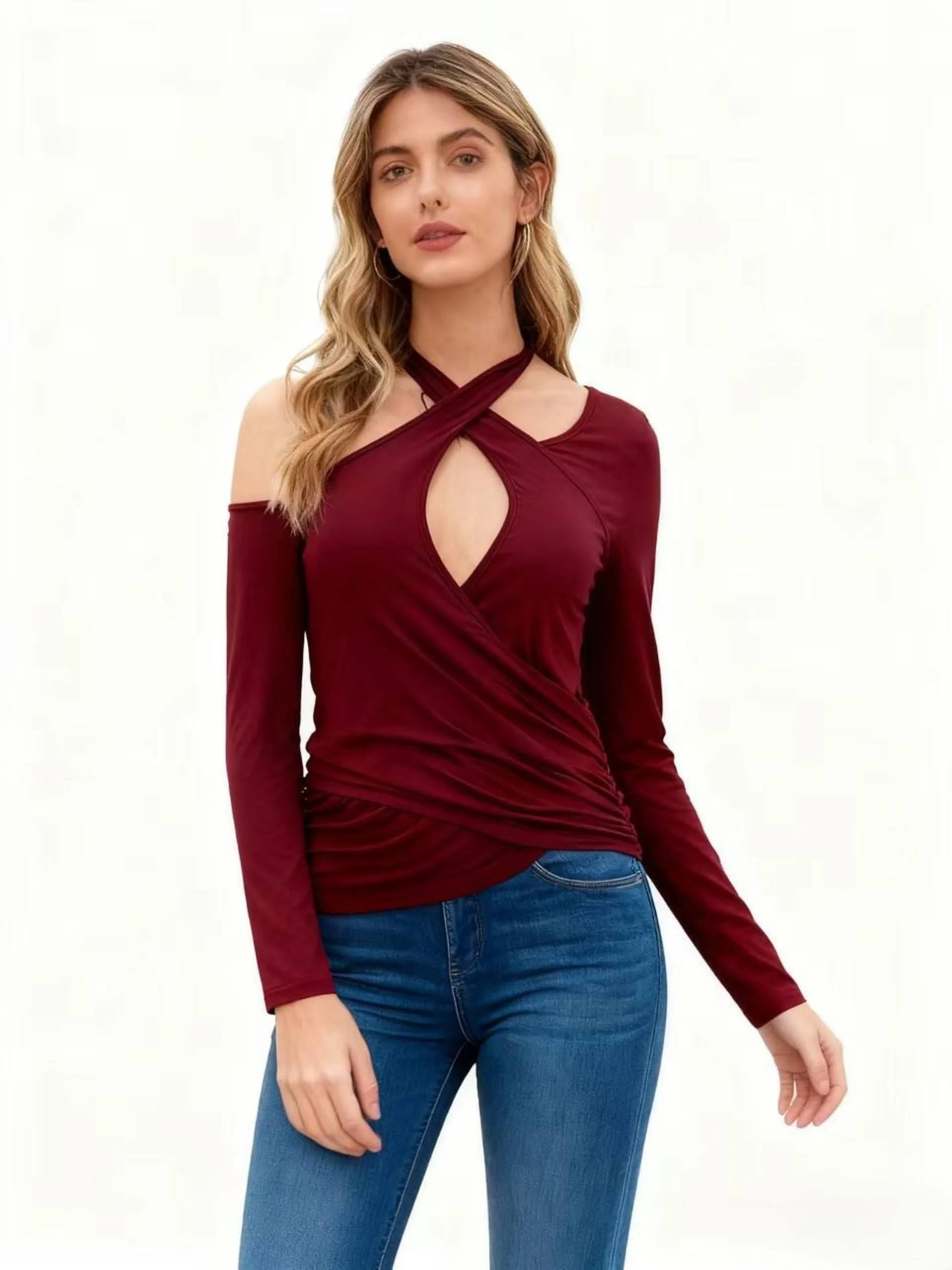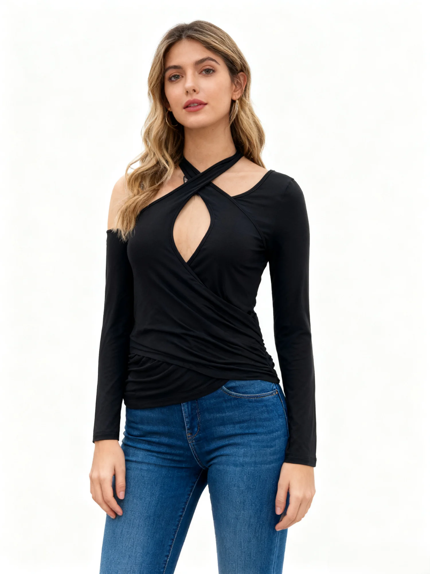 Women's Spring/Autumn Knitted Soft Stretch High Quality Fashion Sexy Cross Halter Cold Shoulder Ruched Long Sleeve Slim Top