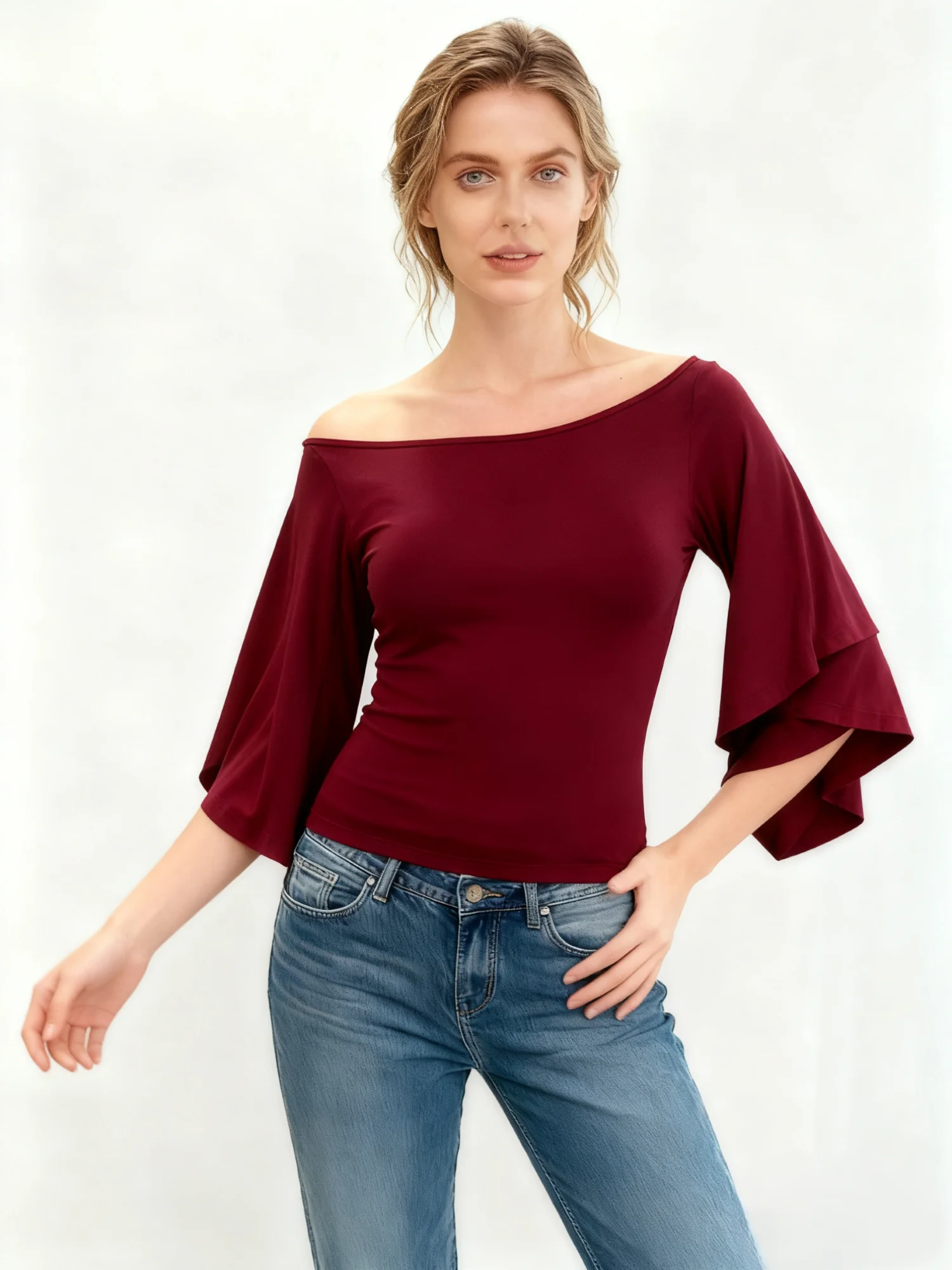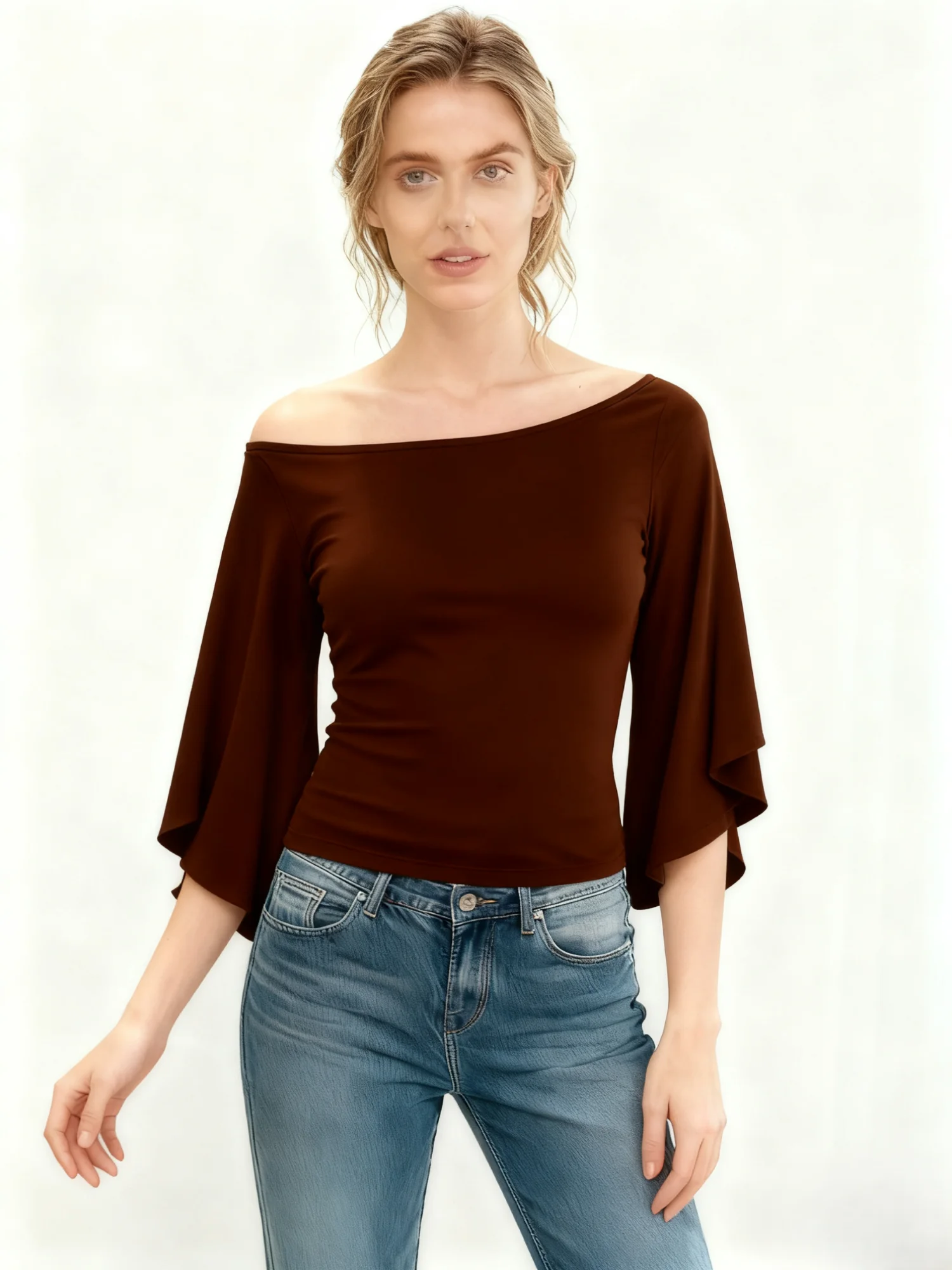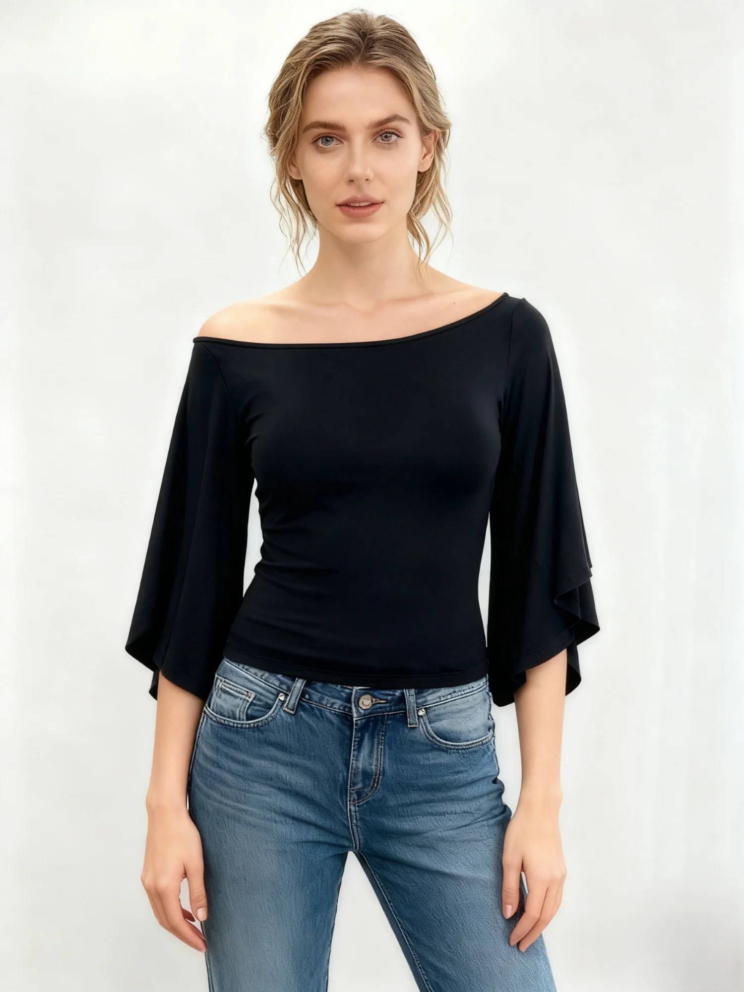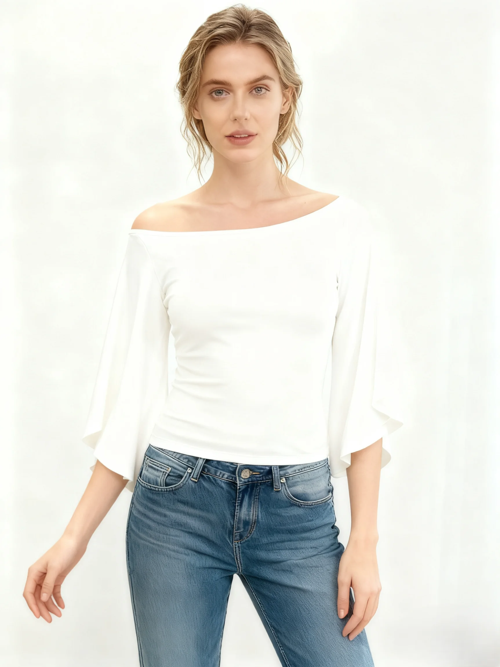 Spring/Autumn Knitted Soft Stretch Fashion Chic Boat Neck Elbow Sleeve Top Off - Shoulder Double - Layered Bell Sleeve Top