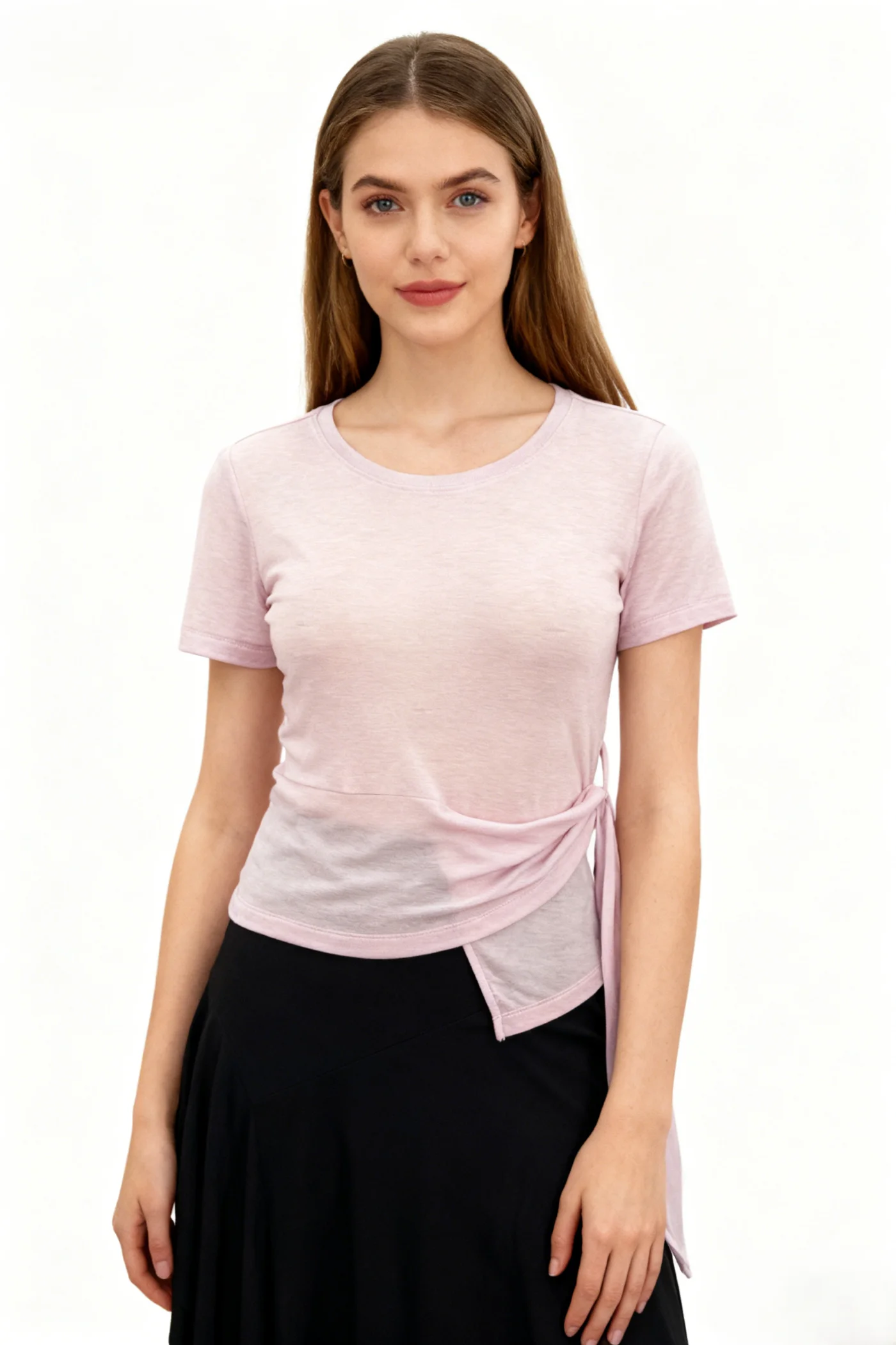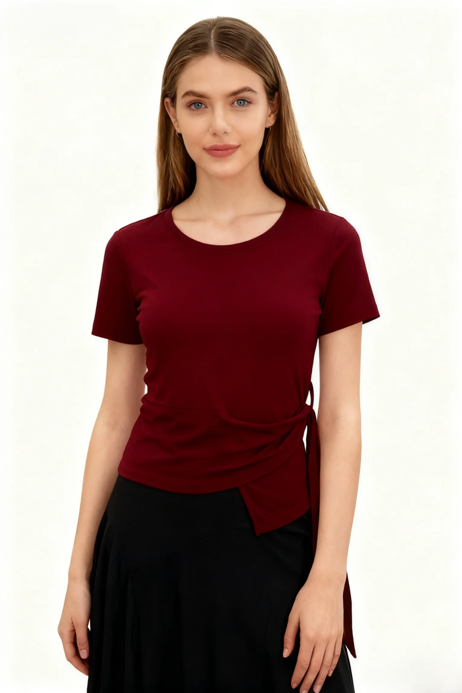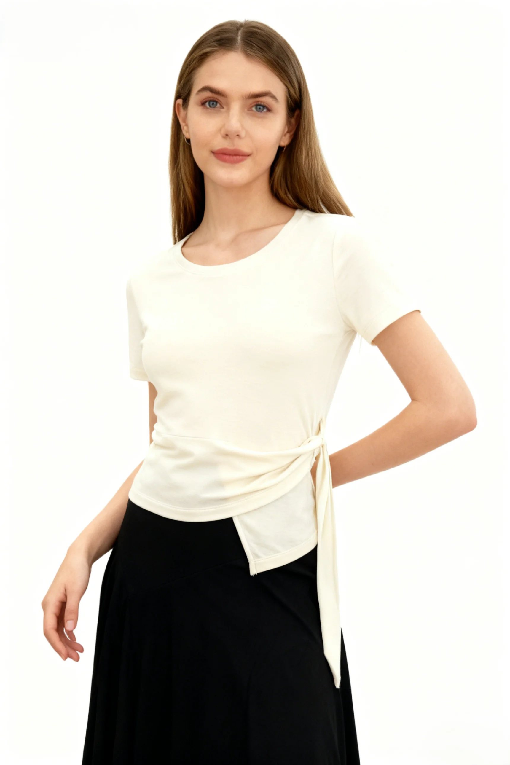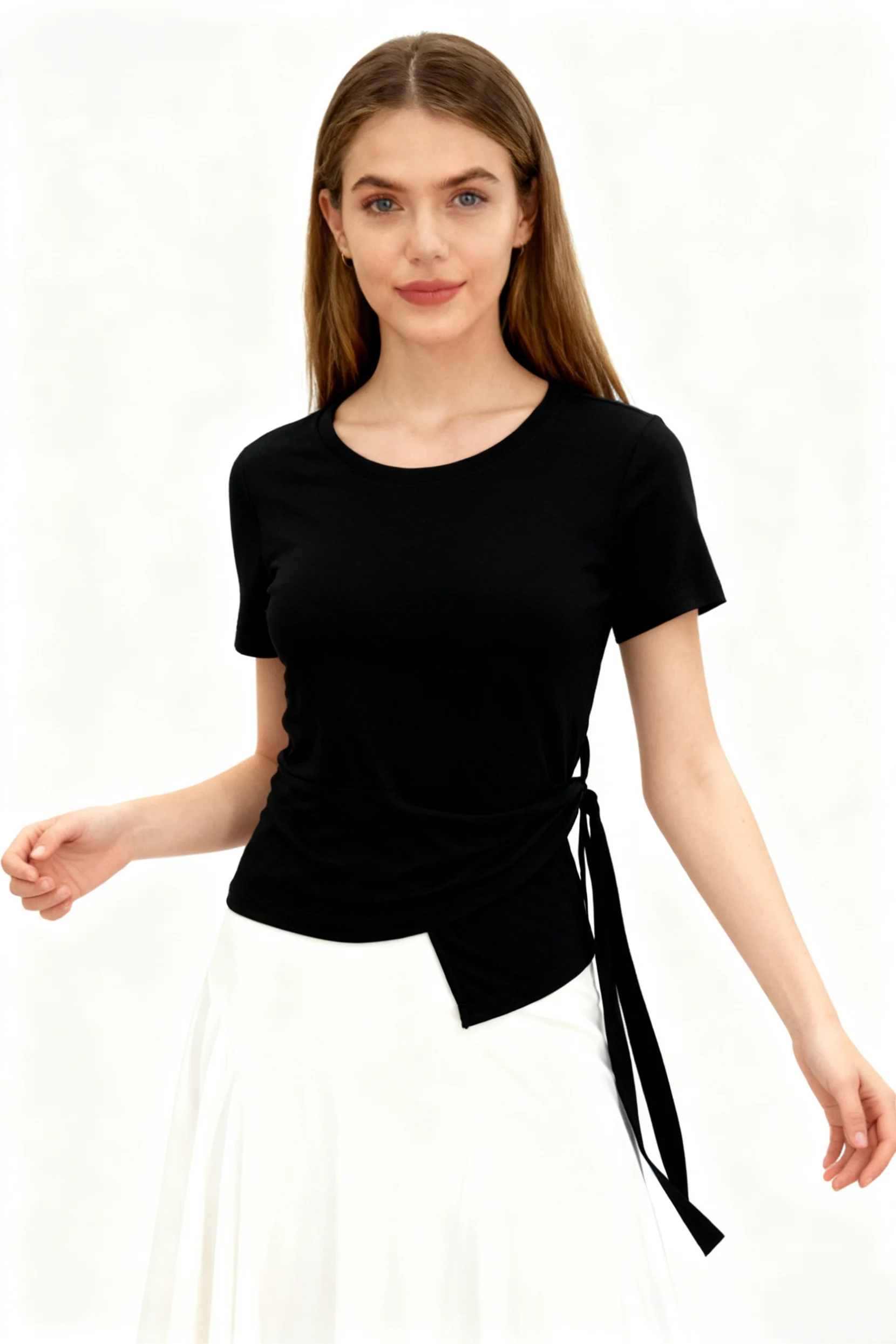 High Quality Asymmetrical Ruffle Trim Details on Bottom Round Neck Fashion Short Sleeves Elegant Slim Fit Shirt