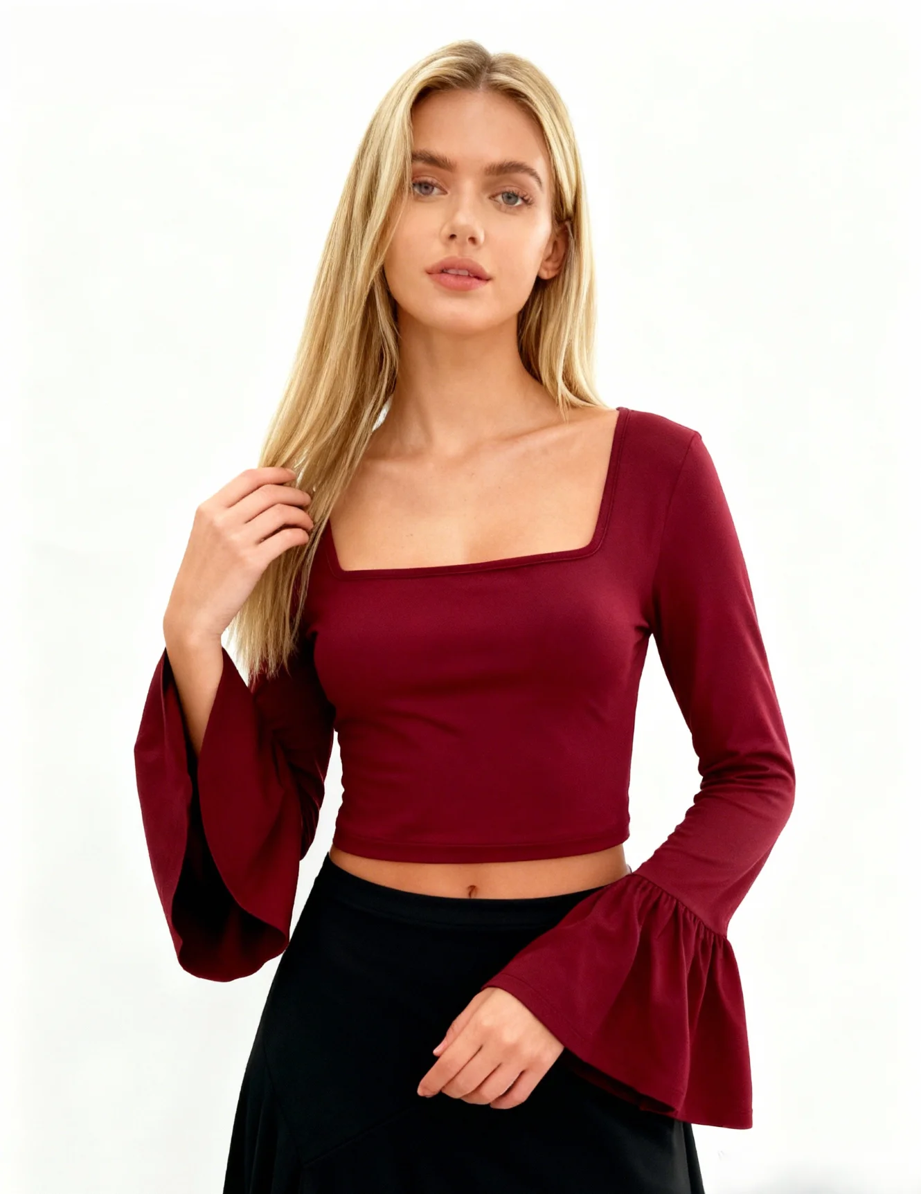 Women Elegant Shirt Stretch Popular Fashion Square Neck Minimalist Design Long Flared Sleeves T Shirt