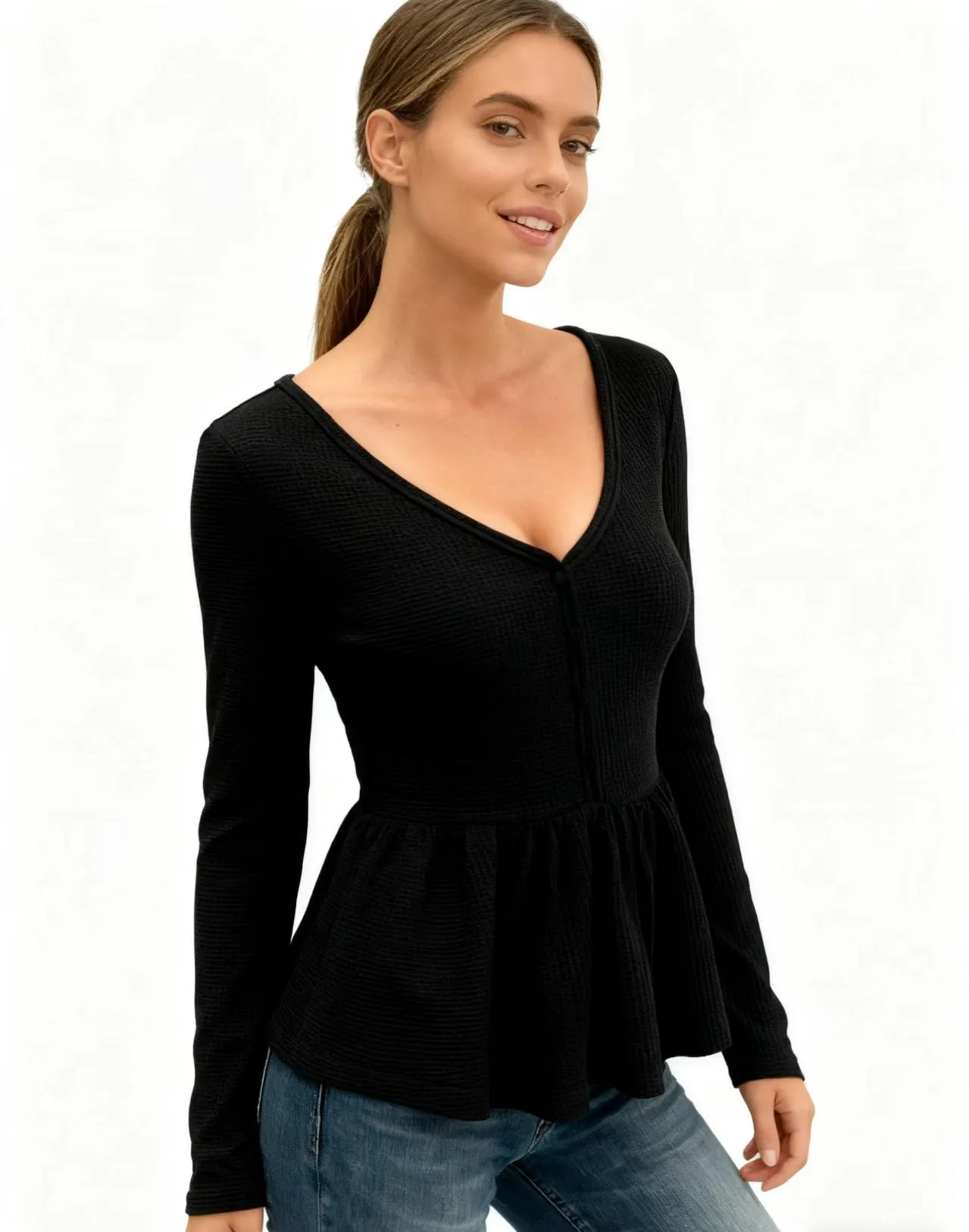 ZYHT 82055 Casual Summer Women's Black Peplum Top Blouse Contrast White Lace Scalloped Hem Puff Sleeves Fabric Floral Pattern