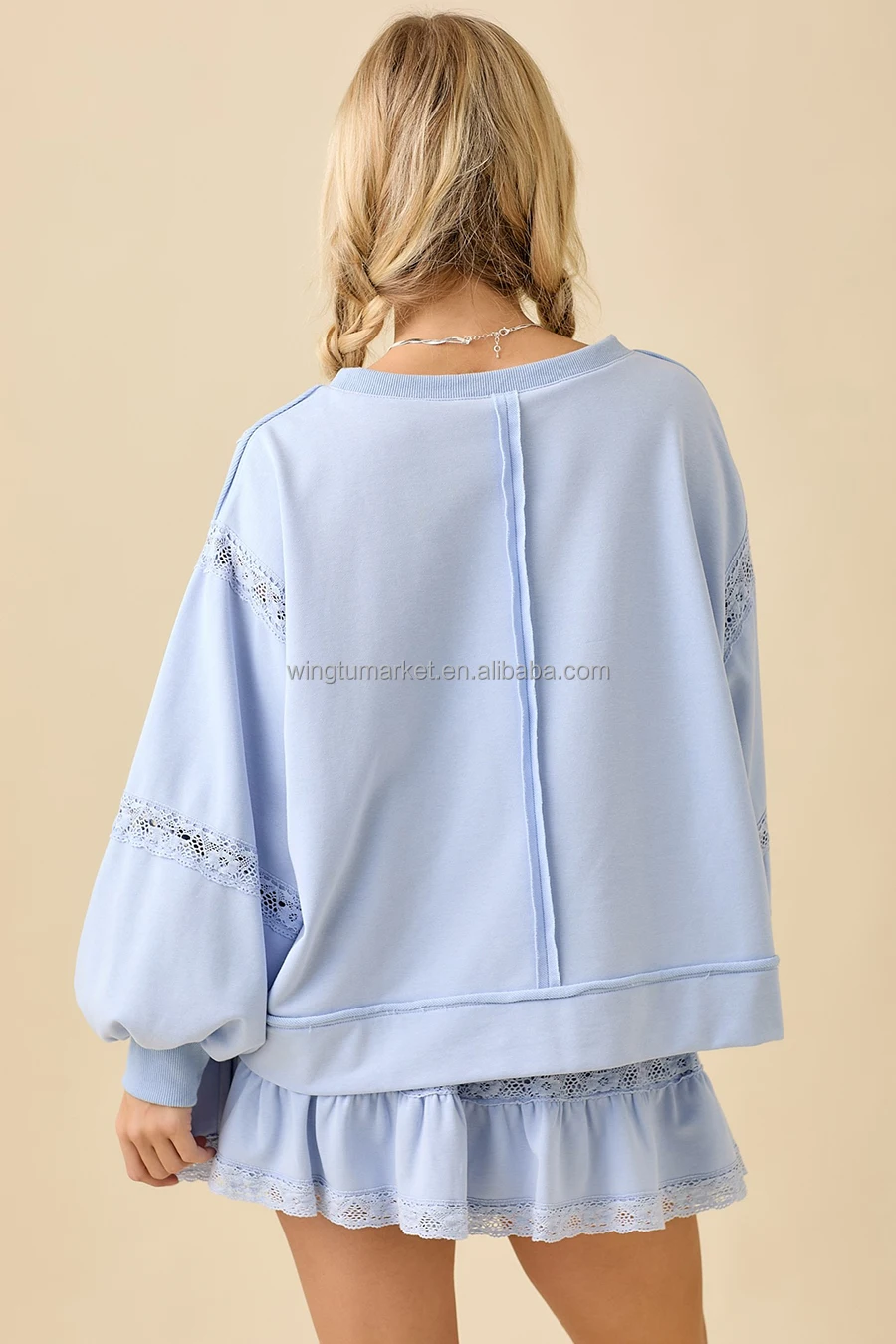 Wholesale Pullover Trendy Pink Long Sleeve Lace Trim Patchwork Lantern Sleeve Casual Women Sweatshirt
