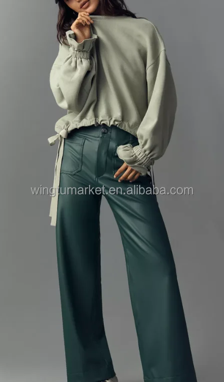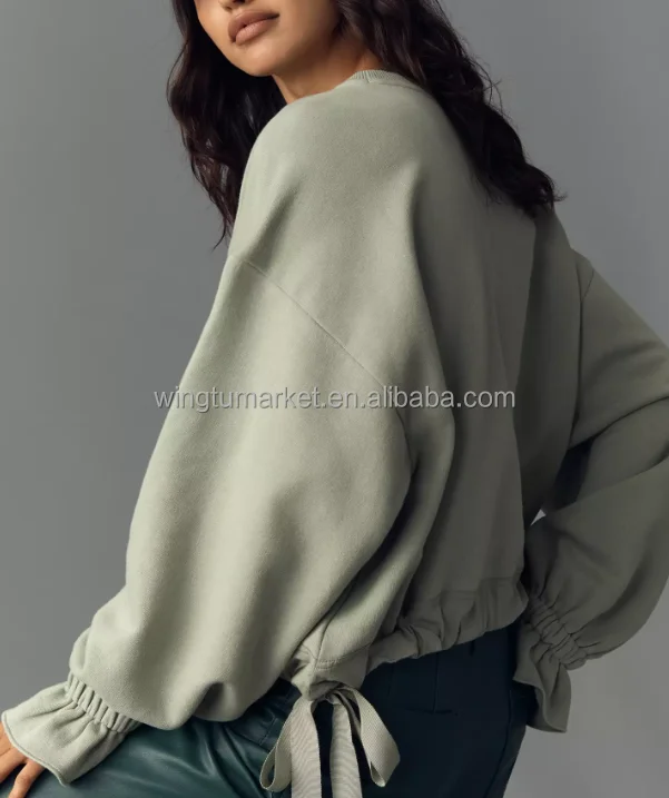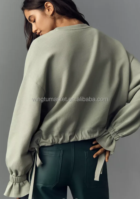 Wholesale Pullover Sage Green Oversized Long Sleeve Crew Neck Drawstring Hem Ruffle Cuff Women Sweatshirt
