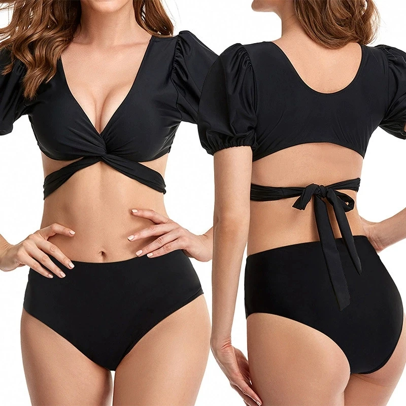 Black Short Sleeve Two Piece Bikini Women Nylon High Stretch Cross Tie Swimwear Summer