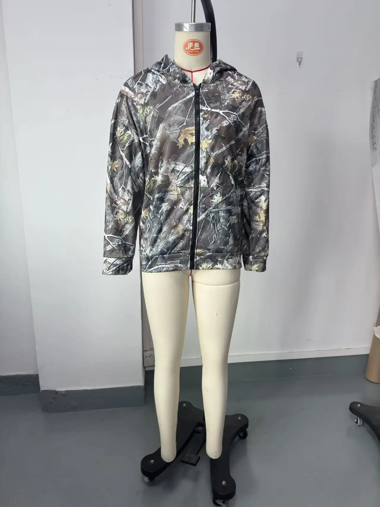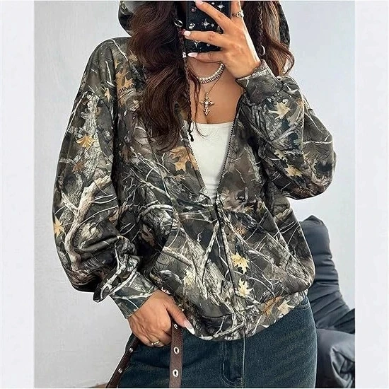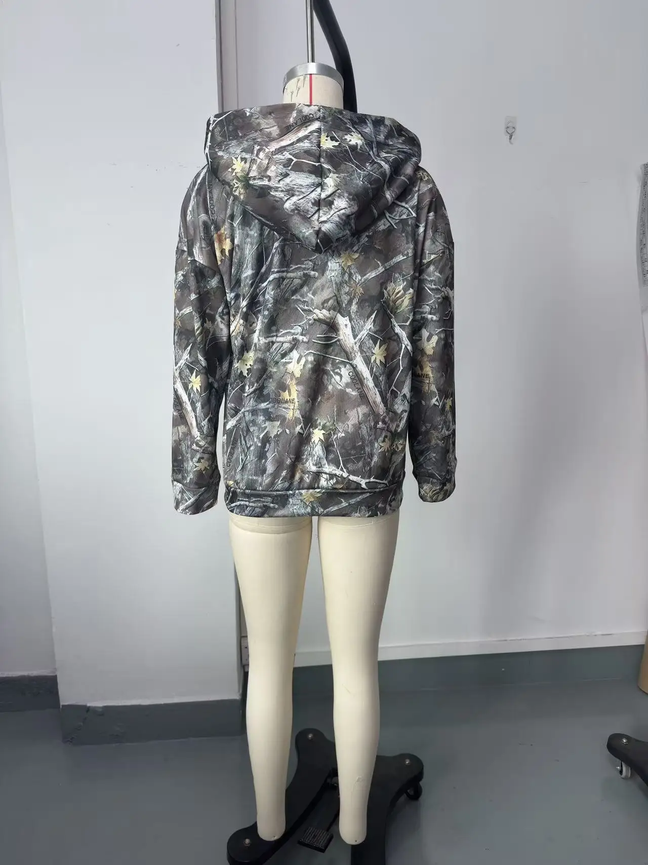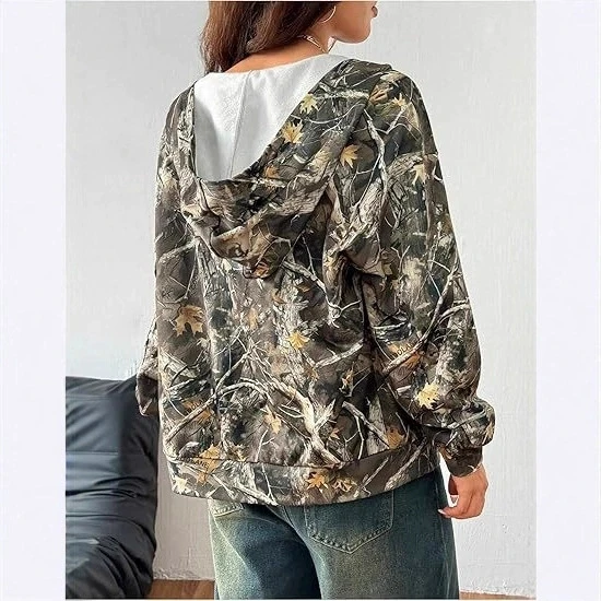 Autumn Loose Long Sleeve Hoodie Top Tree Branch Camo All Over Print Zipper Hooded Jacket Hoodies Women