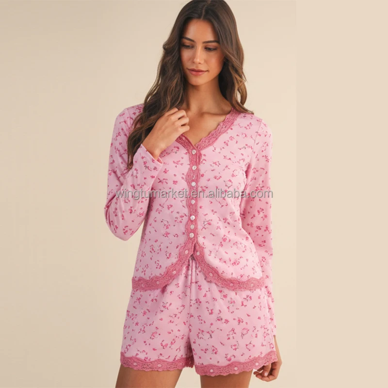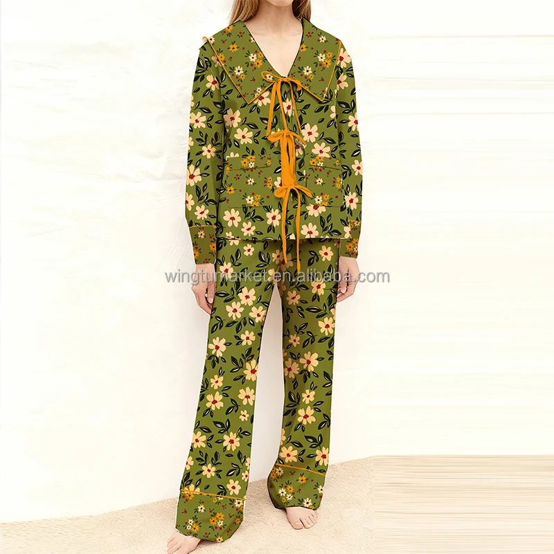 Green Floral Print Long Sleeve Collar Shirt Bow Tie Front Pocket Top Pants Loose Fit Pajama Set Women