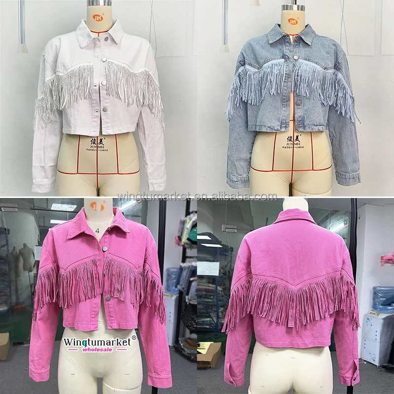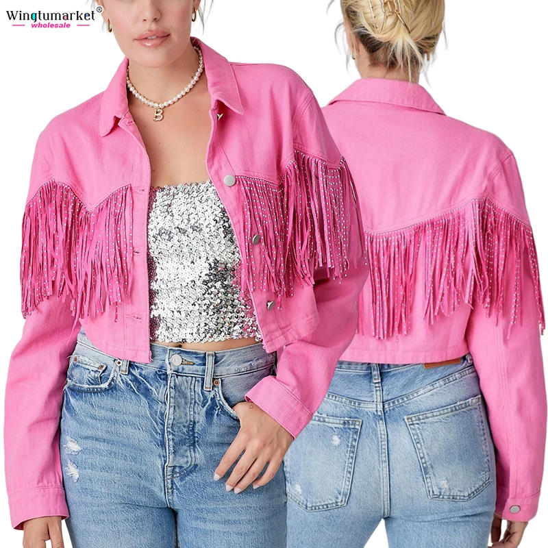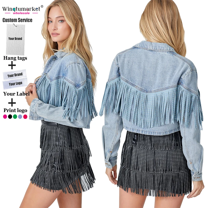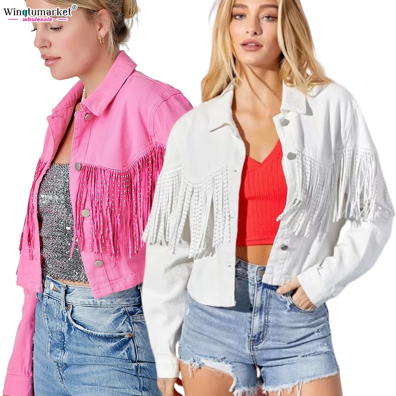 Wholesale Jeans Jackets Fall Ladies Outdoor Short Coat Tassel Rhinestone Fringe Washed Vintage Denim Jacket for Women
