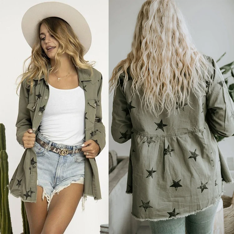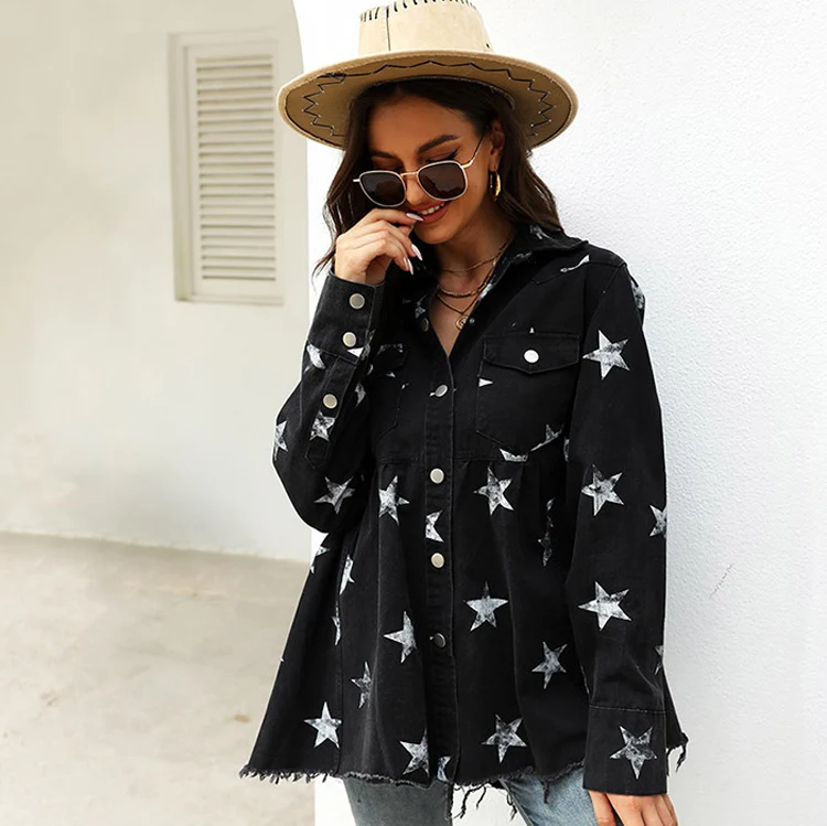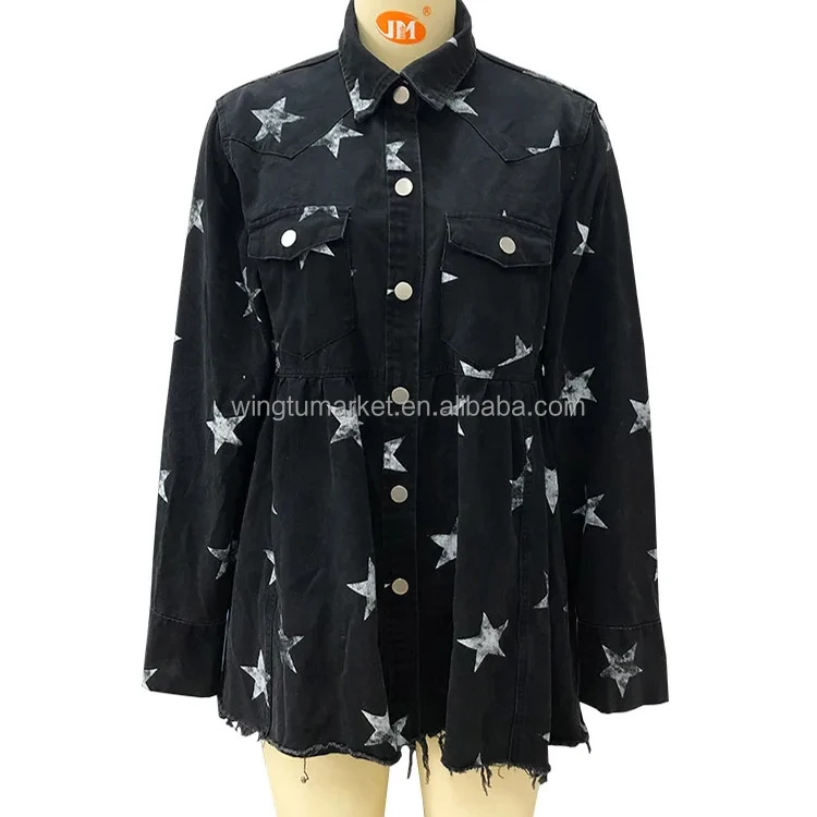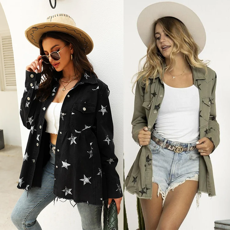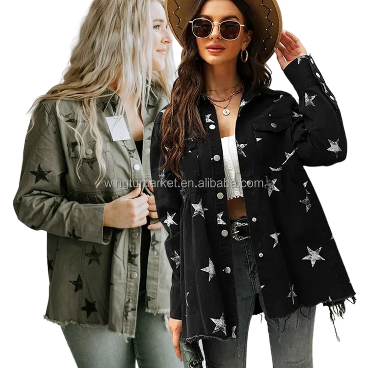 Custom Shirt Coat Distressed Jean Jackets Black Green Print Star Shacket Casual Long Jacket Women