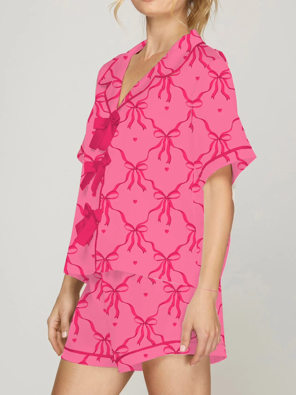 Custom Print Pajama Stylish Lounge Wear Valentines Day Hot pink All Over love Heart Bow Shorts Women Pajamas Sets
