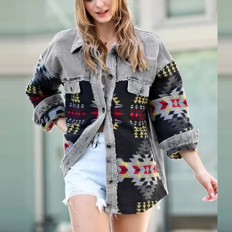 Wingtu Market Aztec Coats Custom Western Tribal Print Tweed Winter Outwear Raw Trim Washed Corduroy Shacket Jackets for Women