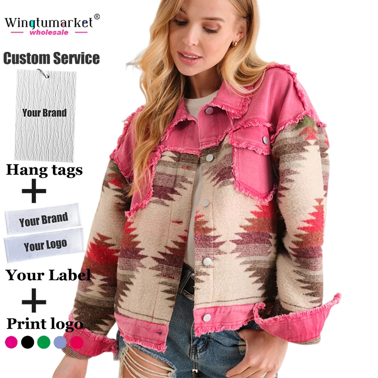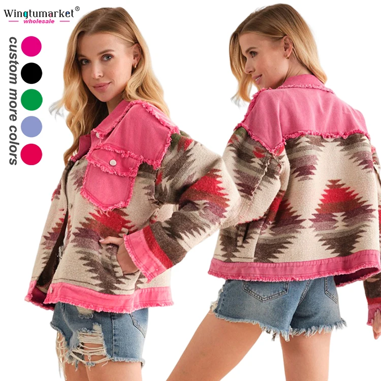 Wholesale Winter Jean Jacket Woman Distressed Raw Fringe Patch Coats Aztec Western Washed Denim Jackets for Women