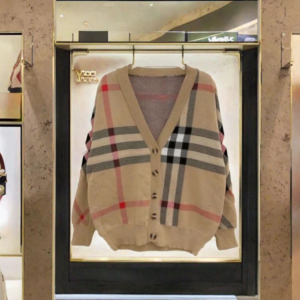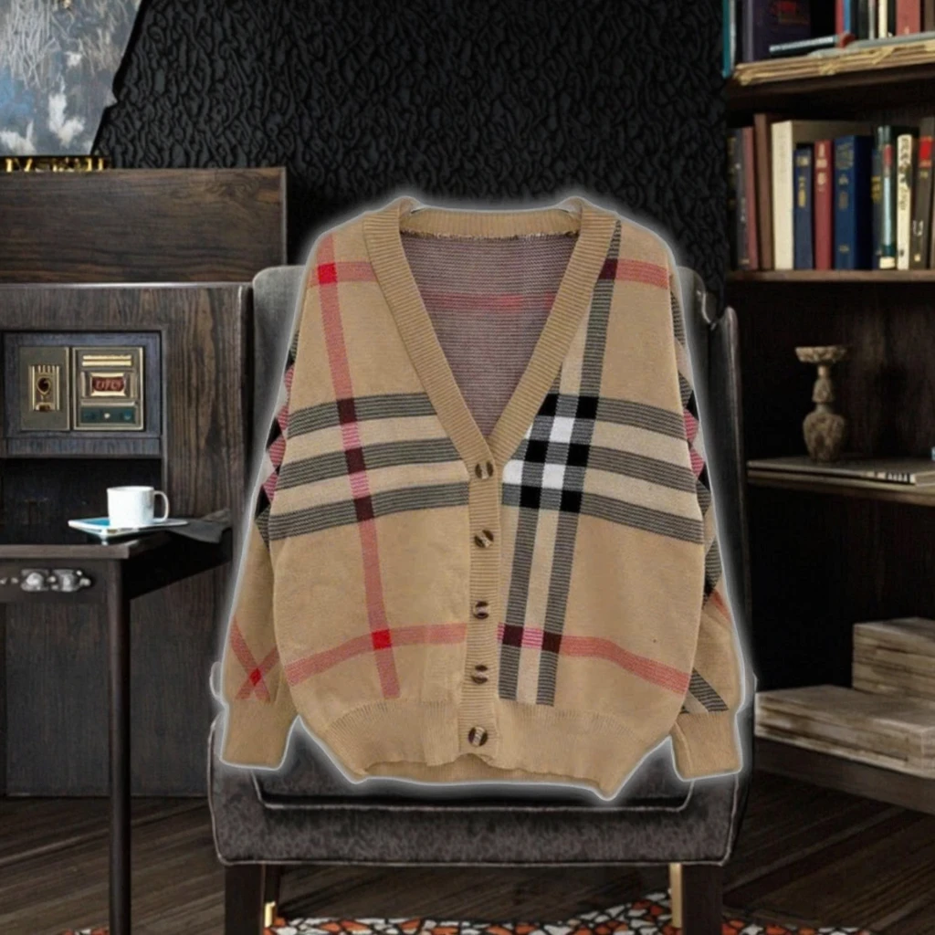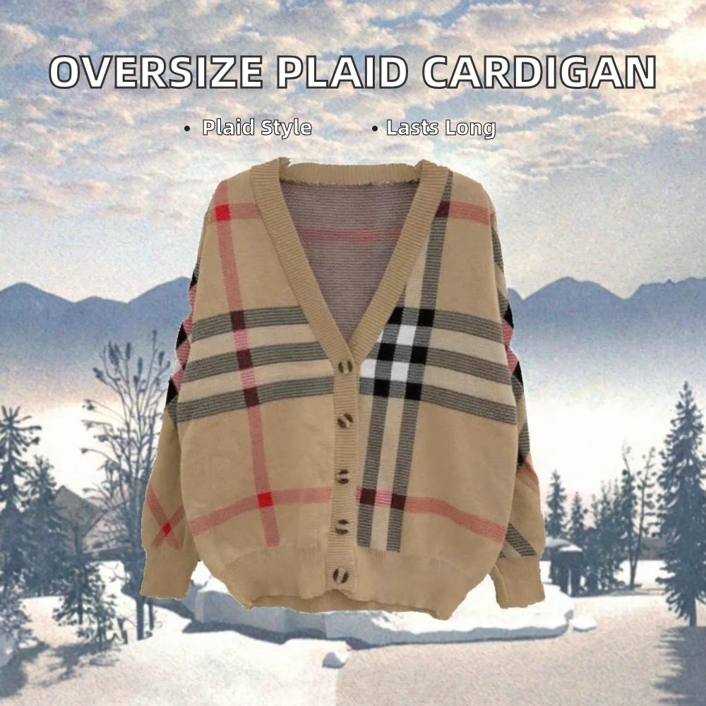 China V-times 2026 Winter Sweet Oversize Classic Cardigan Single Breasted Sweater Ribbing V Neck Long Sleeve Plaid Size Women's