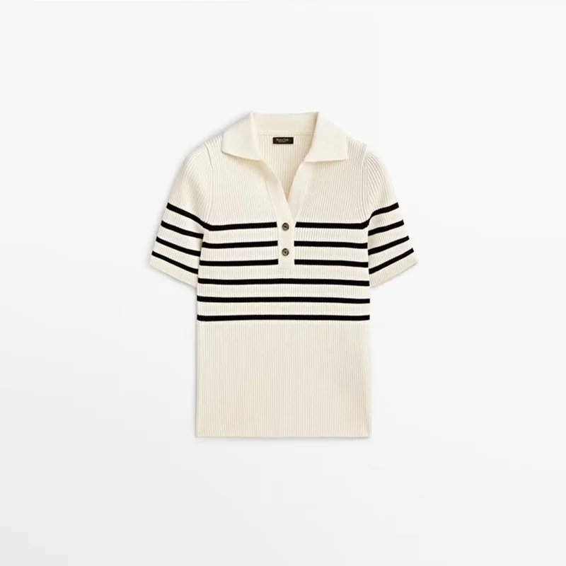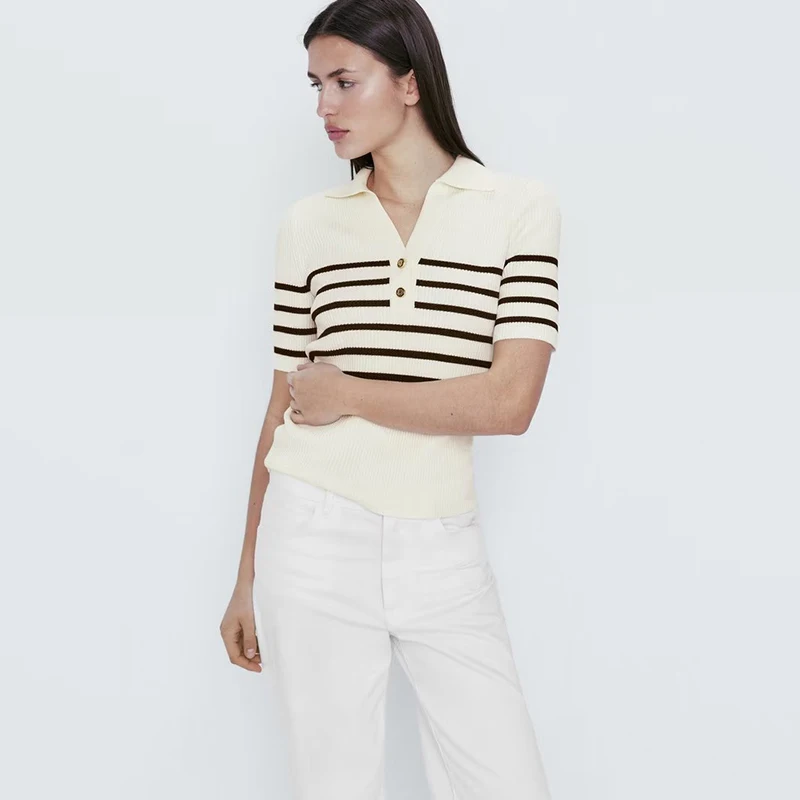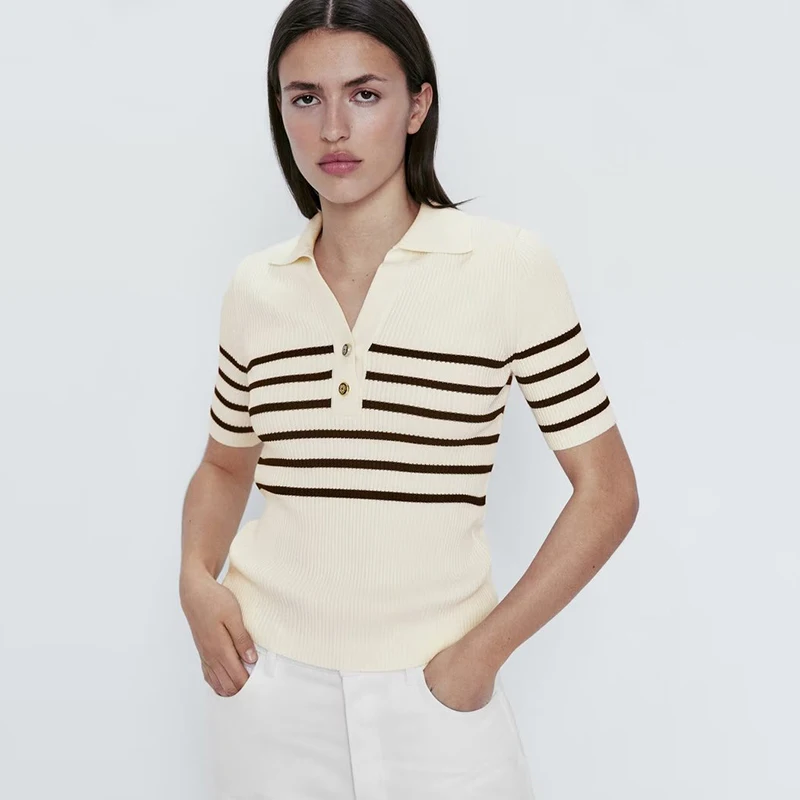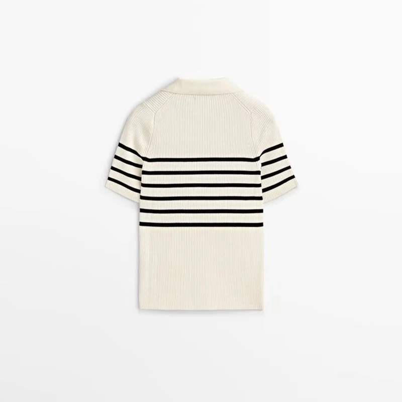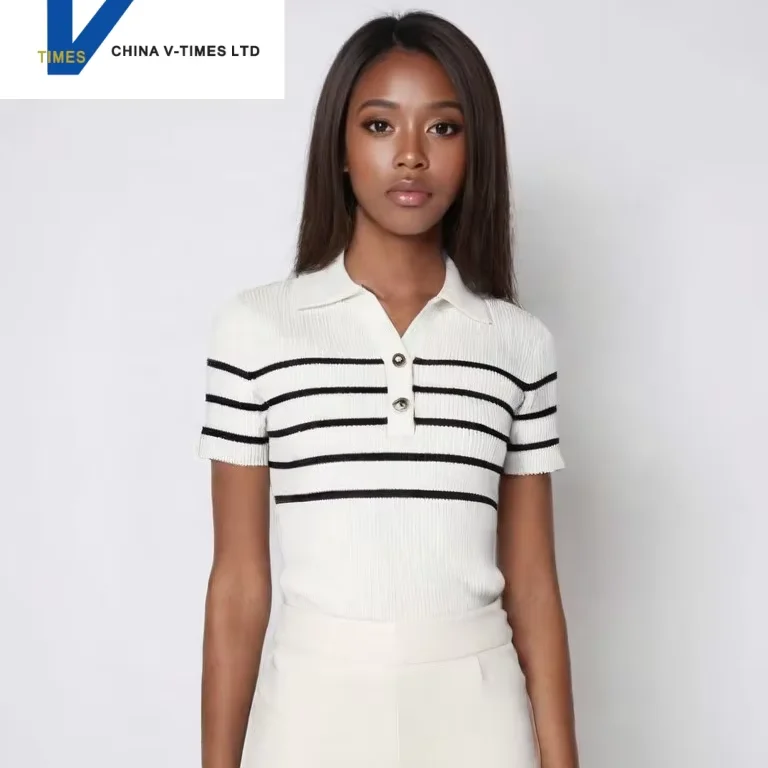 China v-times Women's 2026 Summer New Elegant Slim Fit Striped Short Sleeve Knitted Polo Shirt Casual Style Knee Fashionable