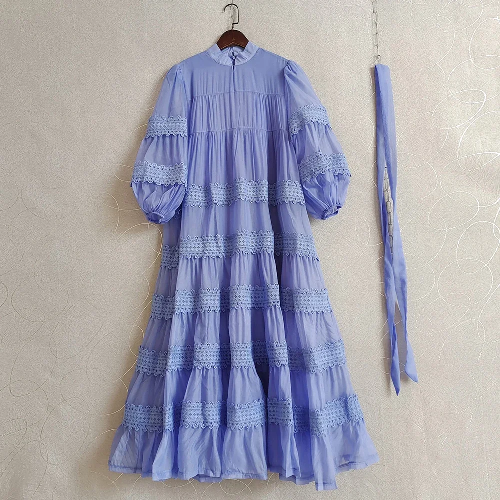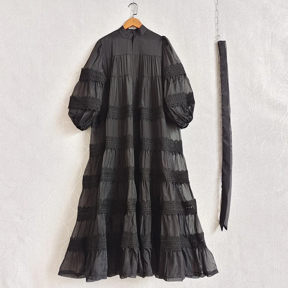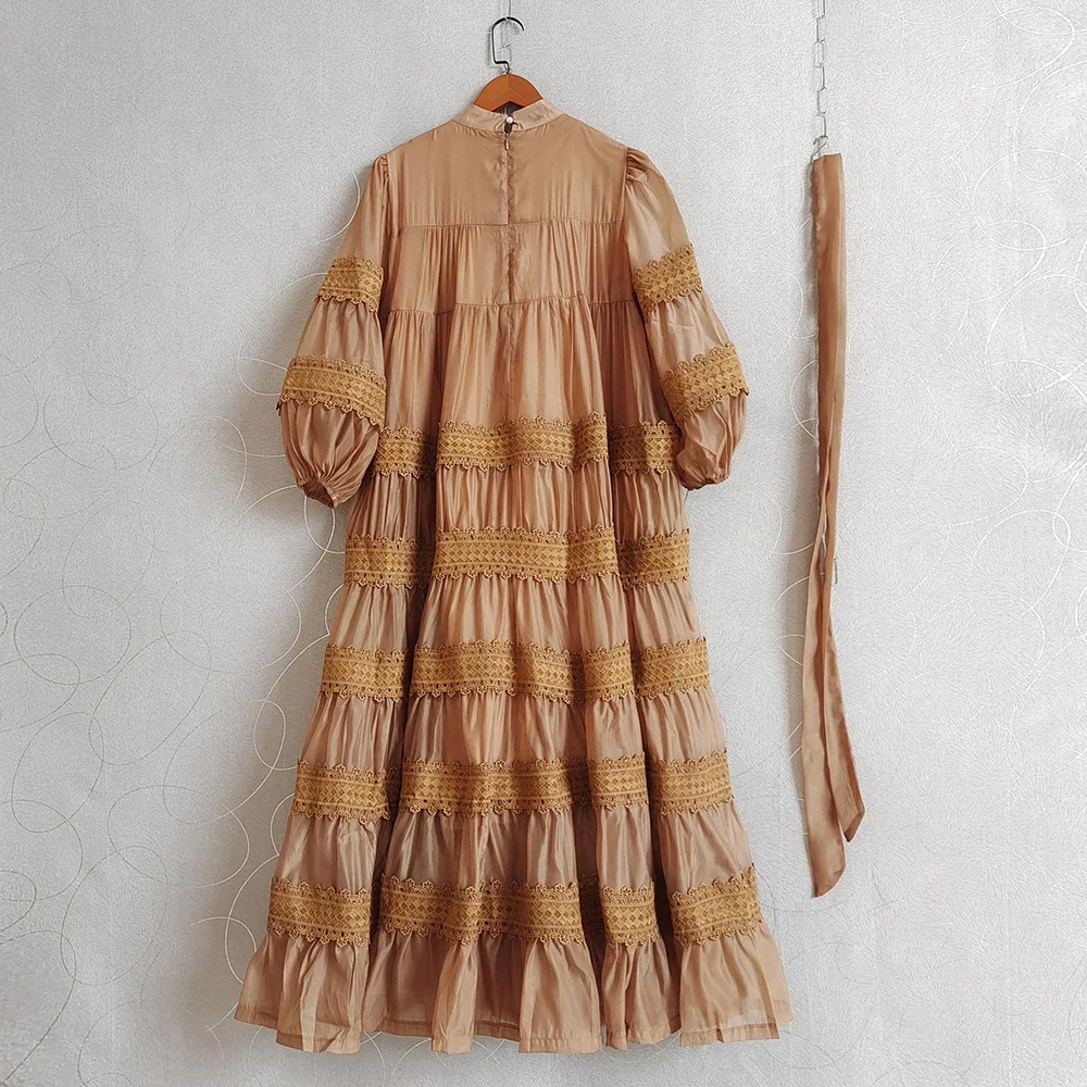 AELESEEN Women's Loose Long Casual Dress Half Lantern Sleeve Lace Patchwork Single-Breasted Belt Spring Autumn Day Front