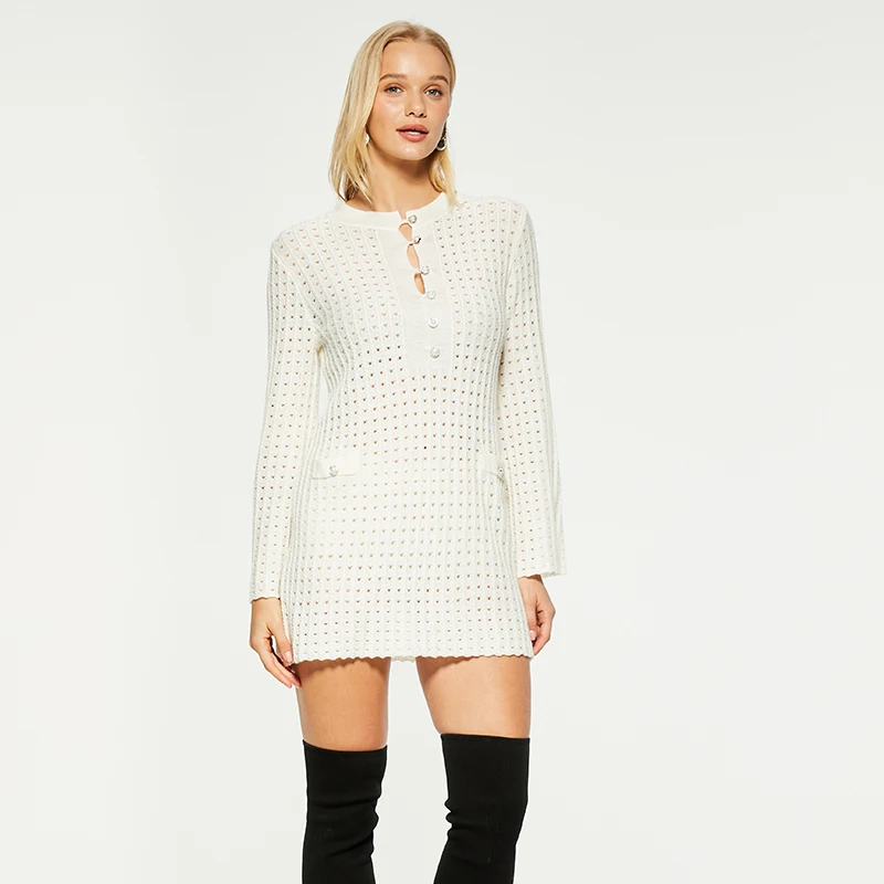 2026 Fall Lady New Arrival Flowers Decorate O-neck Long Sleeve Ruffles Cuff Wear Women Knit Hollow Out A-line Mini Solid Dress