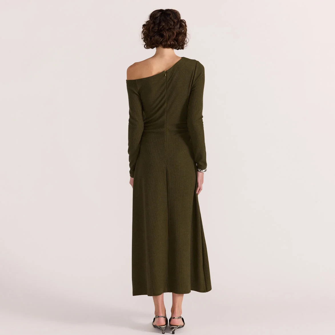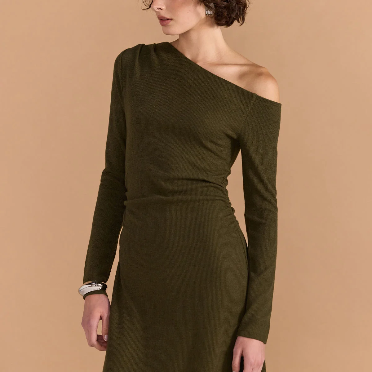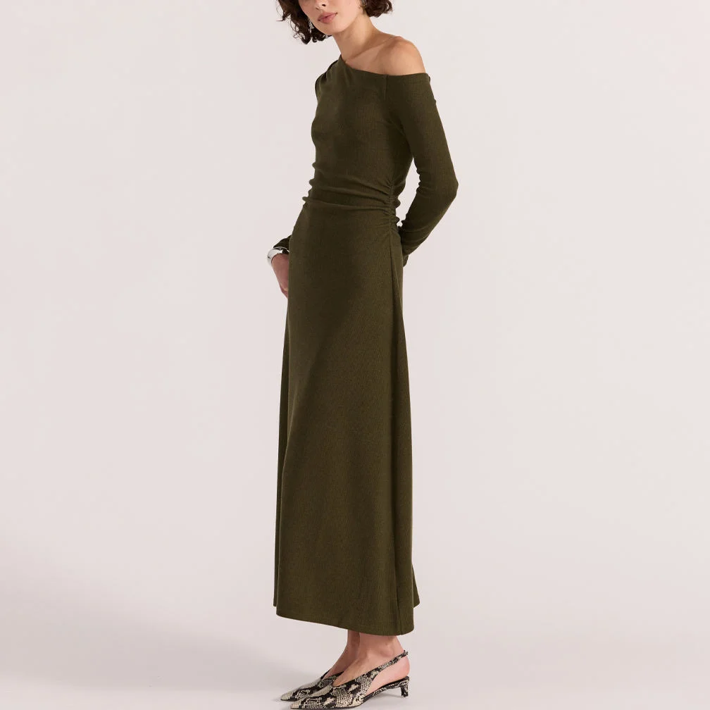 ZYHT 73905 Dusty Rose Off-The-Shoulder Long Sleeve Stretch Jersey Dress Ruched Bodice Floor Length Fish Tail Maxi Dress