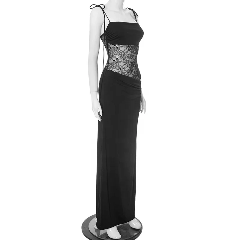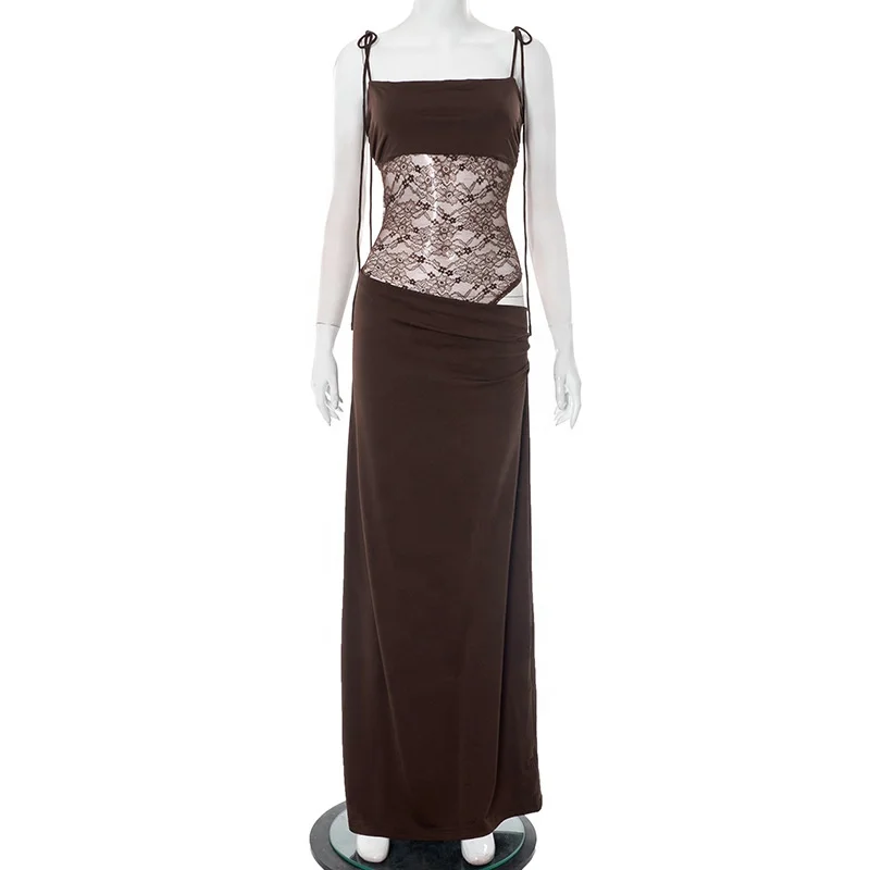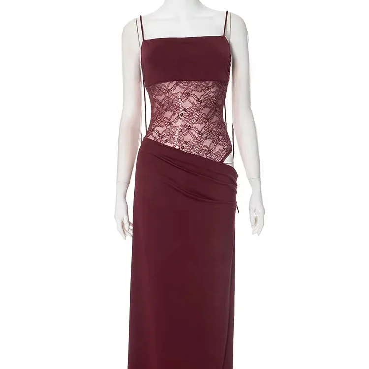 Spring and Summer New Solid Color Lace Splicing Halter Tie Rope Waistless Sexy Dresses