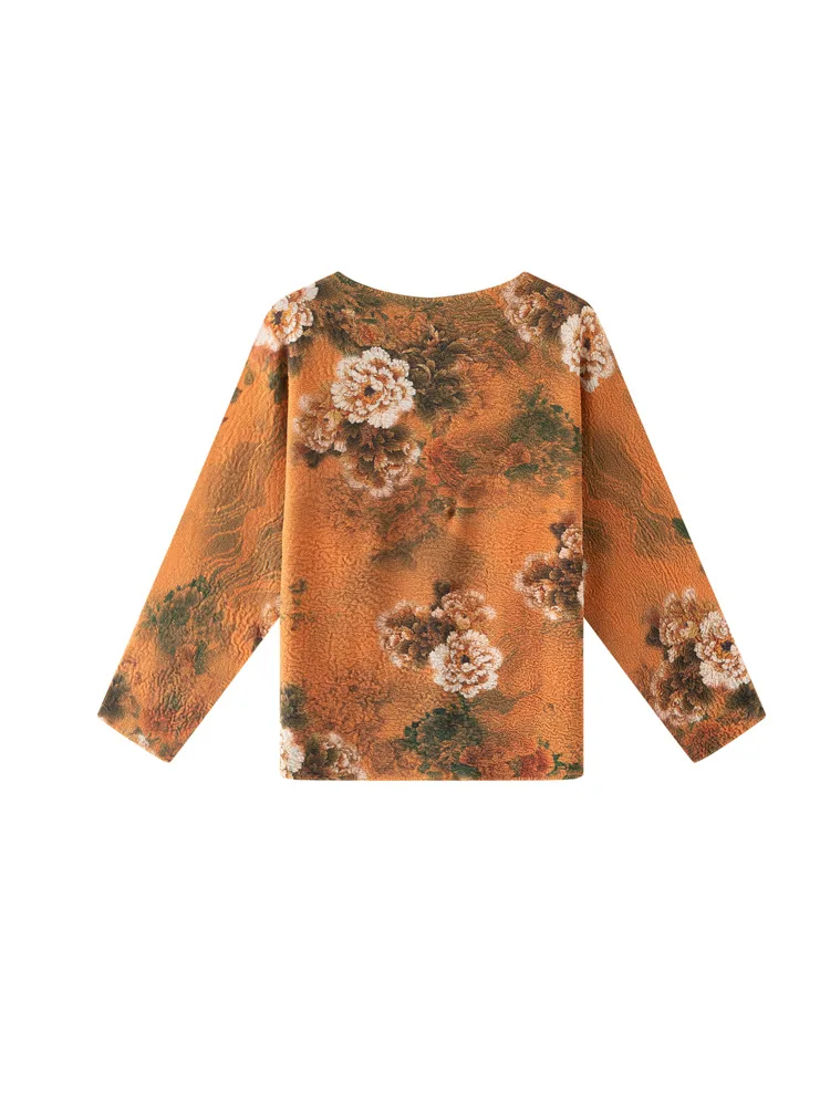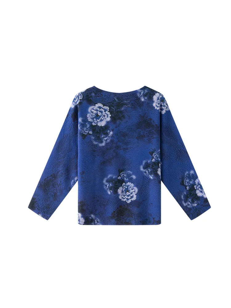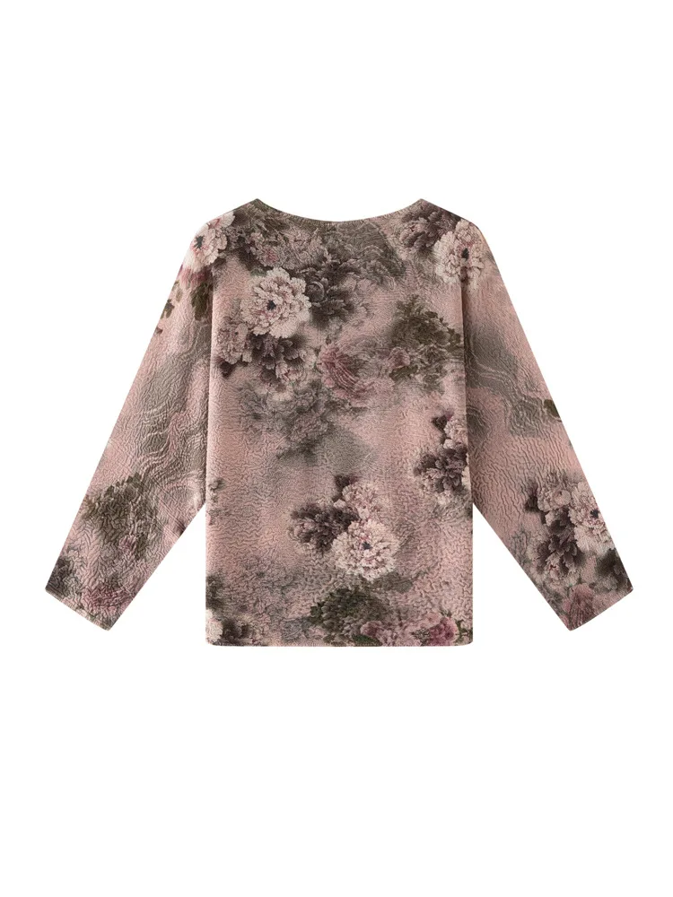 Miyake High-end Niche Crewneck Long-sleeved Polyester Floral T-shirt Elegant Commuter All-match Loose Pleated Women's Spring