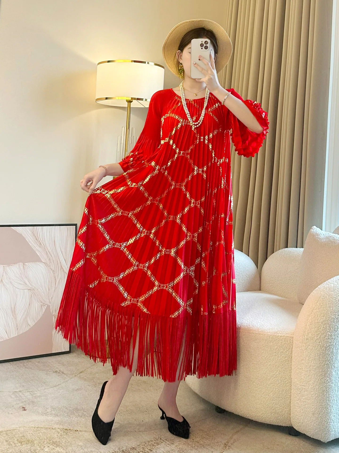 2026 Spring Summer New Generation Light Luxury Gilded Chiffon Dress Casual Age-Reducing Loose Fat Midi Length Natural Front