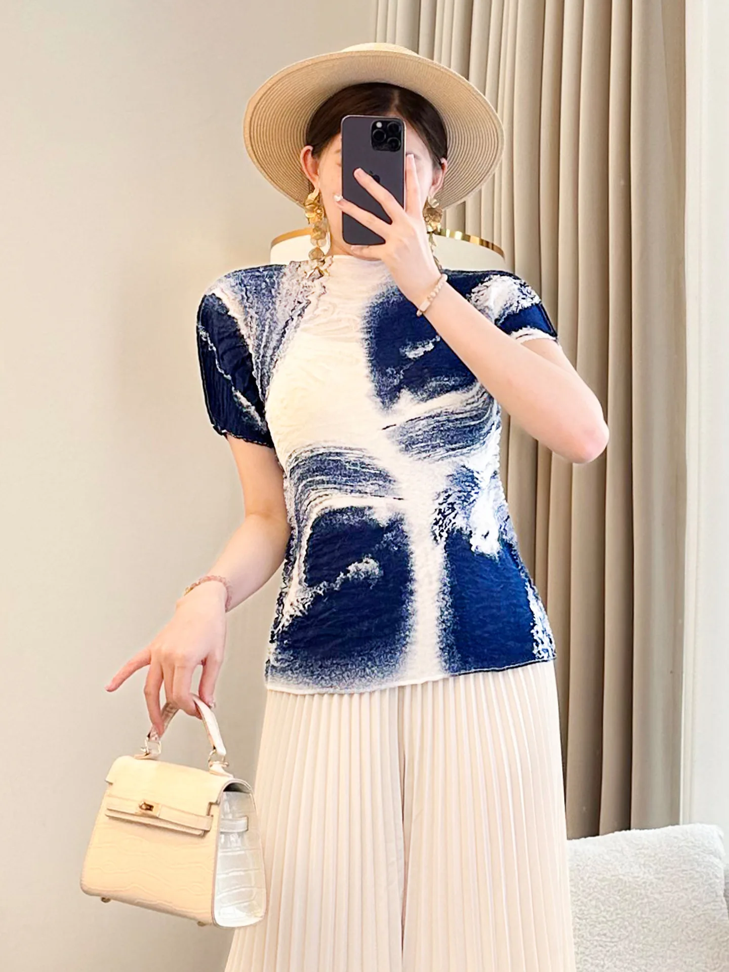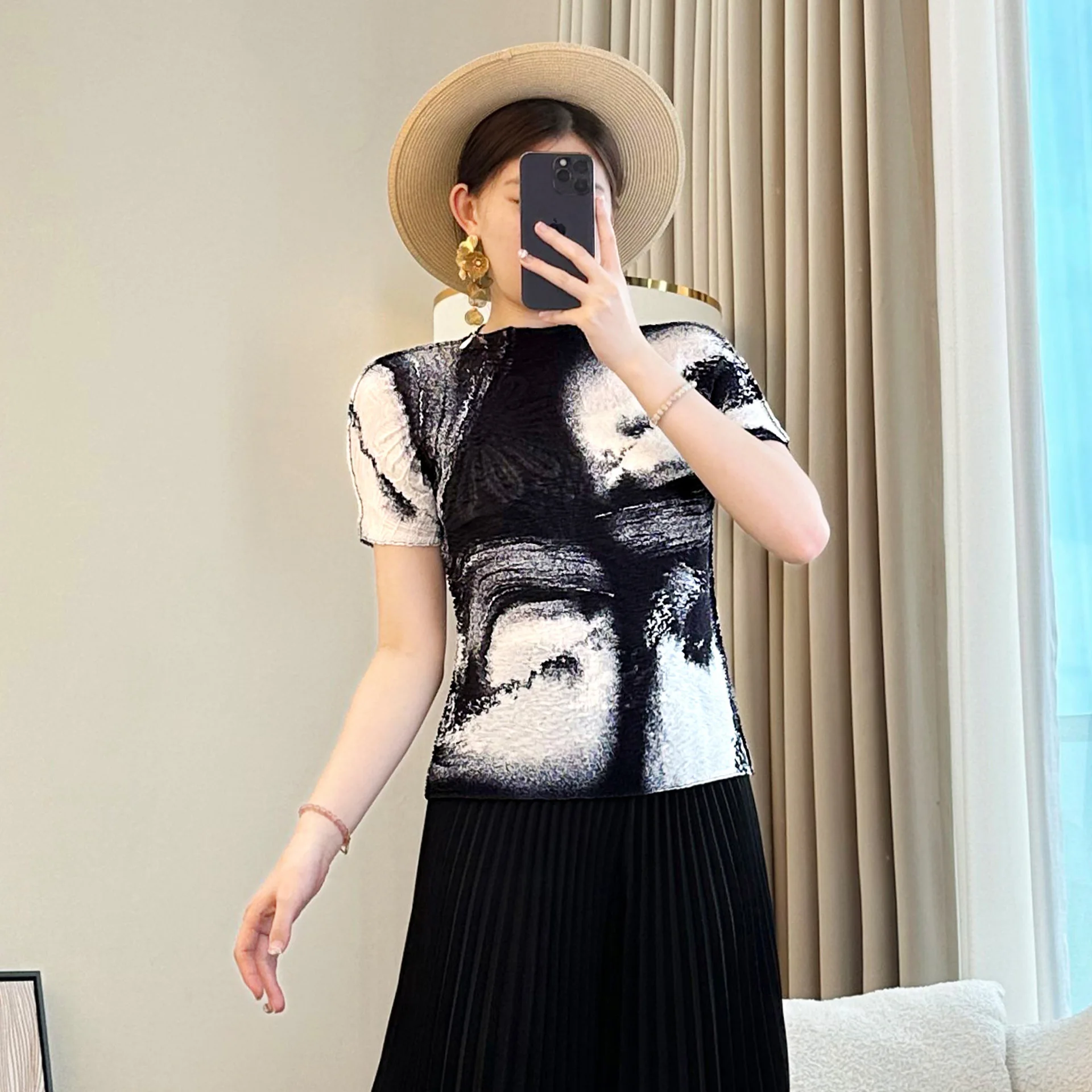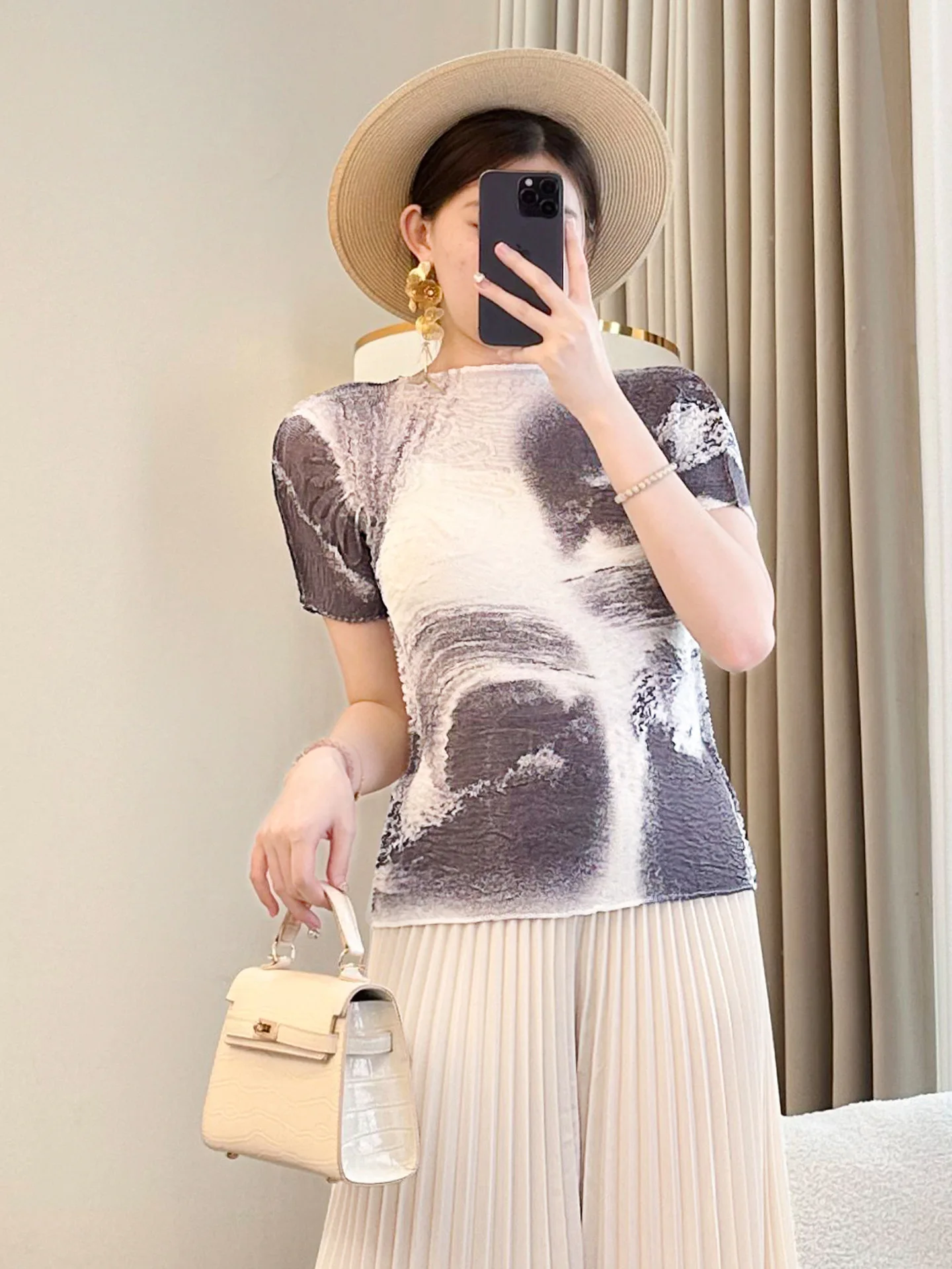 Japanese-Style Miyake Gradient Batwing Sleeve Crewneck Pleated Top Women's Summer Short-Sleeve T-Shirt Loose New Casual
