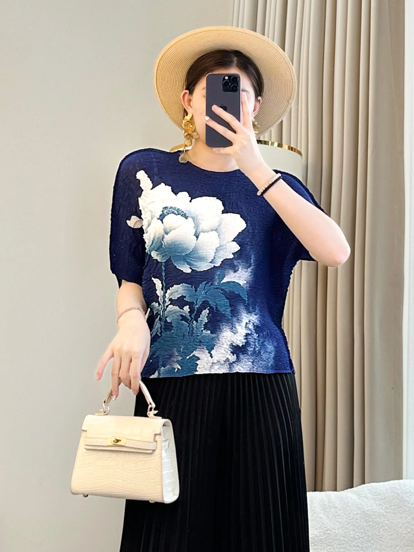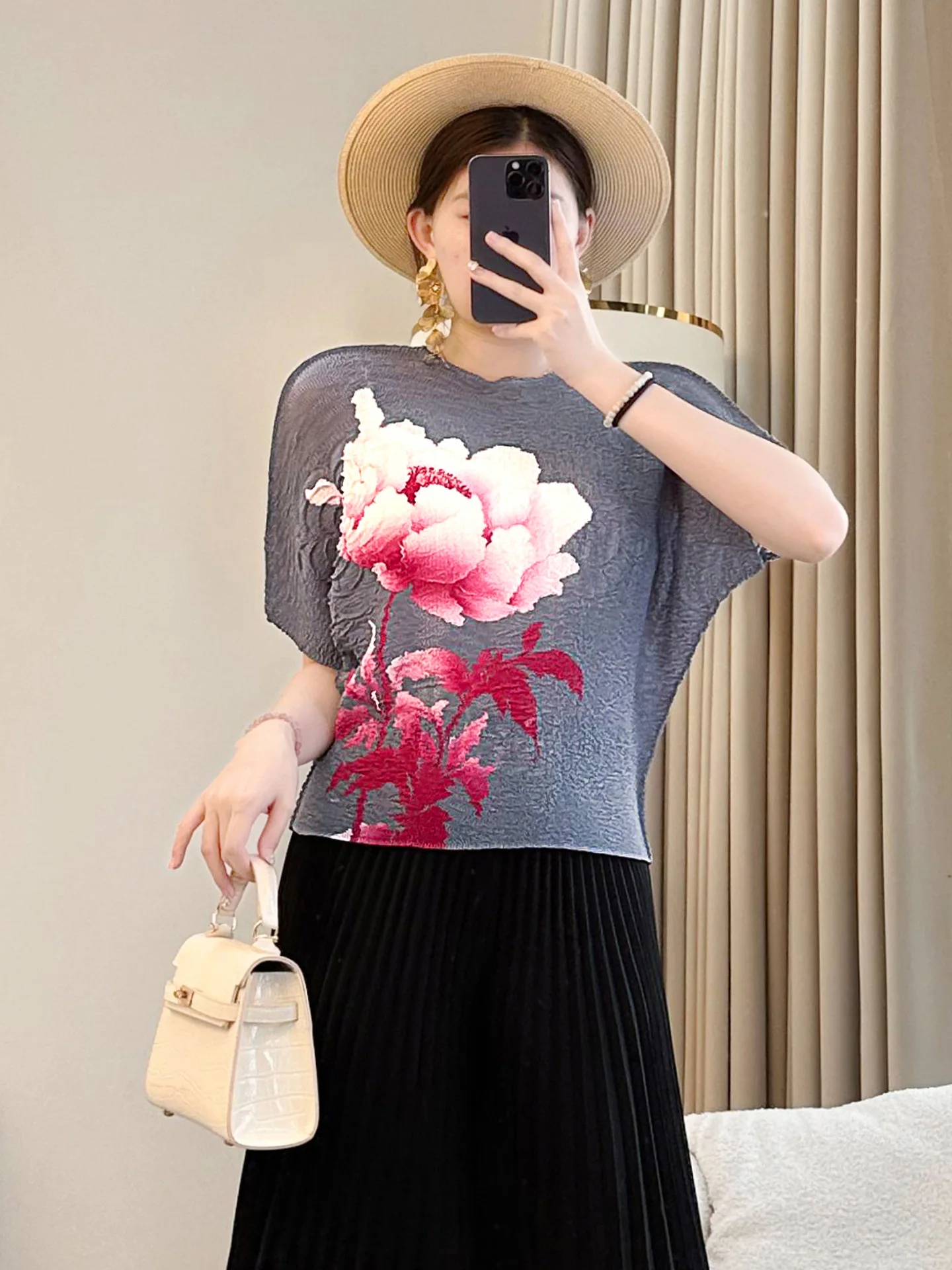 Miyake Women's Summer Top with Elegant Crewneck & Pleated Bat Sleeve Age-Reducing Loose Fit New Floral Print Knitted T-Shirt