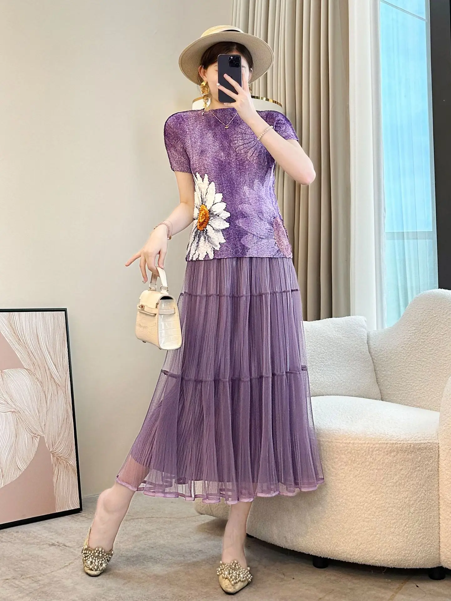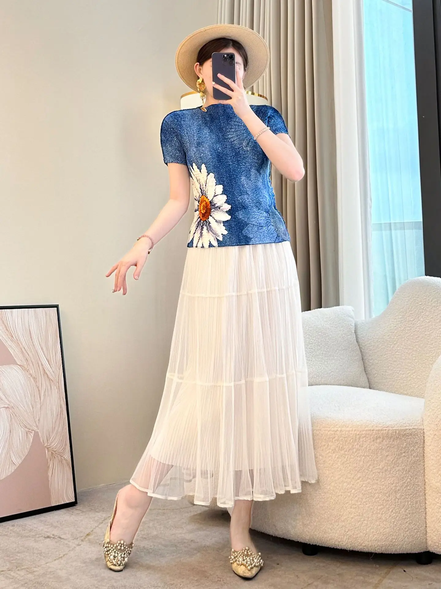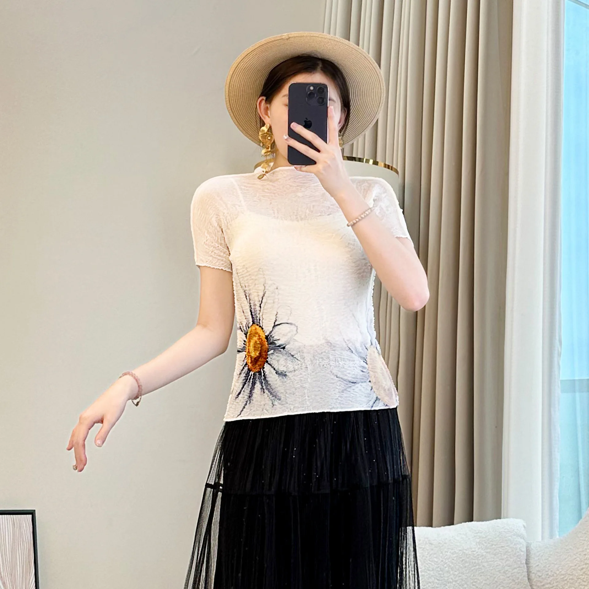 Miyake Women's Summer Ins Elegant Slim-Fit Short-Sleeved Top Commuter Fashion Daisy-Printed T-Shirt Casual Style