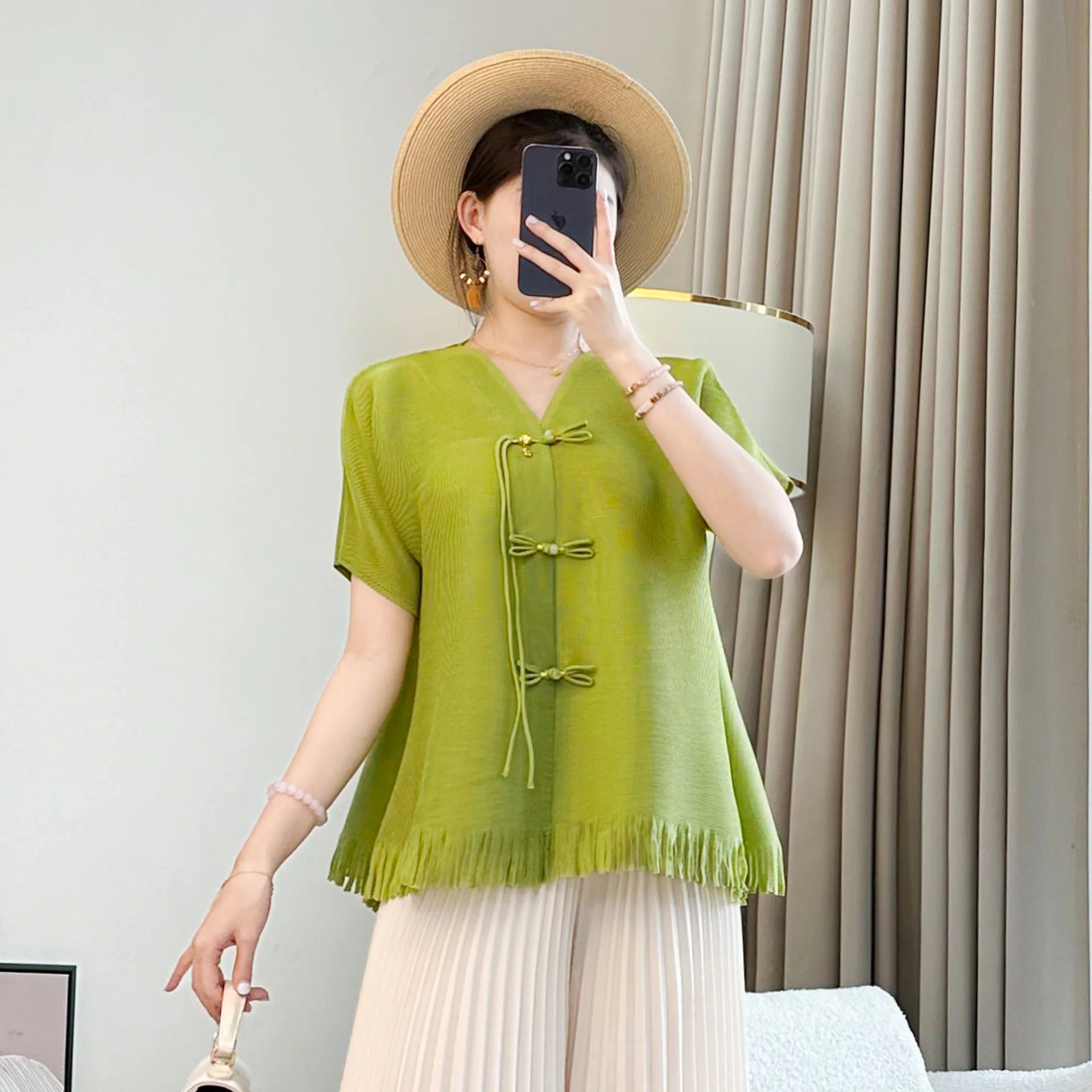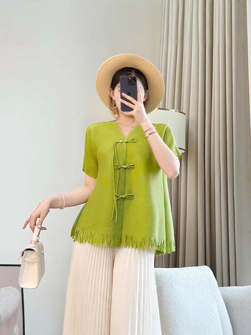 2026 Women's Short-Sleeved V-Neck T-Shirt New Chinese-Style Summer Pullover Top with National Style Buckle